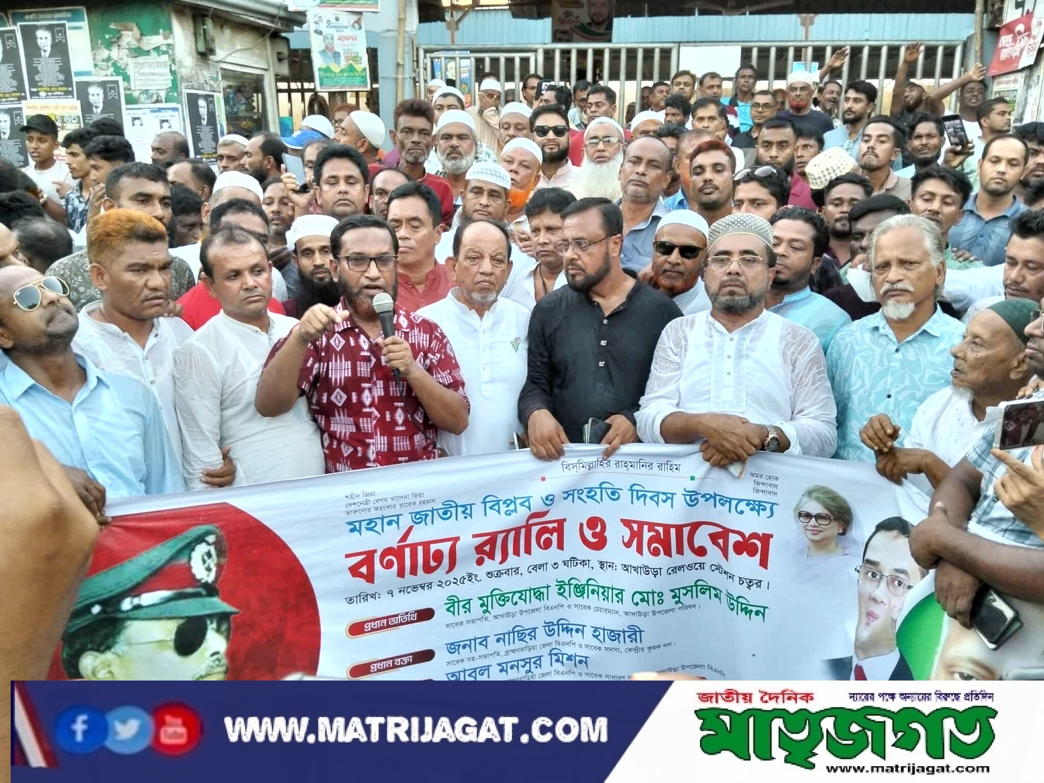 মহান জাতীয় বিপ্লব ও সংহতি দিবস উপলক্ষে আজ শুক্রবার বিকাল ৩টায় আখাউড়া রেলওয়ে স্টেশন চত্বরে এক বর্ণাঢ্য র্যালির আয়োজন করা হয়। অনুষ্ঠানে রাজনৈতিক, সামাজিক ও সাংস্কৃতিক সংগঠনের নেতৃবৃন্দসহ সর্বস্তরের জনগণের অংশগ্রহণে এলাকা উৎসবমুখর হয়ে ওঠে। র্যালিতে প্রধান অতিথি হিসেবে উপস্থিত ছিলেন বীর মুক্তিযোদ্ধা ইঞ্জিনিয়ার মোহাম্মদ মুসলিম উদ্দিন। প্রধান বক্তা হিসেবে বক্তব্য রাখেন জননেতা নাসির উদ্দিন হাজারী। বিশেষ অতিথি ছিলেন আবুল মুনসুর মিশন। অনুষ্ঠানের সভাপতিত্ব করেন আলহাজ্ব খন্দকার মোঃ বিল্লাল হোসেন। বক্তারা তাঁদের বক্তব্যে ৭ নভেম্বরের ঐতিহাসিক গুরুত্ব তুলে ধরে বলেন, এই দিনটি জাতীয় ঐক্য, বিপ্লব ও সংহতির প্রতীক। তাঁরা বিএনপির সকল অংশ ও নেতৃত্বকে একই ছায়াতলে এসে জাতীয় ঐক্যের স্বার্থে একসঙ্গে কাজ করার আহ্বান জানান। র্যালি শেষে আলোচনা সভা অনুষ্ঠিত হয়, যেখানে বক্তারা দেশপ্রেম, গণতন্ত্র রক্ষা ও উন্নয়নের ধারাবাহিকতা বজায় রাখার আহ্বান জানান।