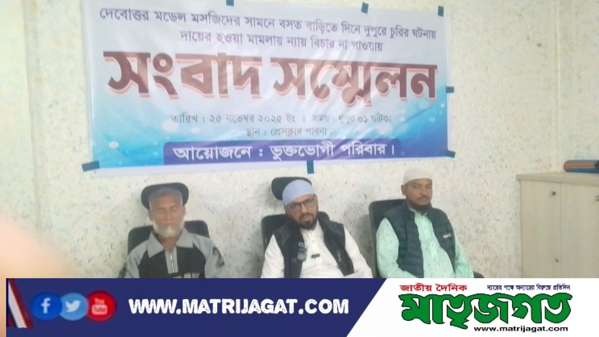পাবনার আটঘরিয়ার দেবোত্তর মডেল মসজিদের সামনে বসত বাড়িতে দিনেদুপুরে চুরির ঘটনায় আটঘরিয়া থানা পুলিশ, ৭ মাসেও কাউকে গ্রেফতার করতে পারেনি বলে সংবাদ সম্মেলনে অভিযোগ করেন ভুক্তভোগী পরিবার। এবিষয়ে ভুক্তভোগী পরিবার প্রেসক্লাব পাবনায় সংবাদ সম্মেলন করেছেন।
