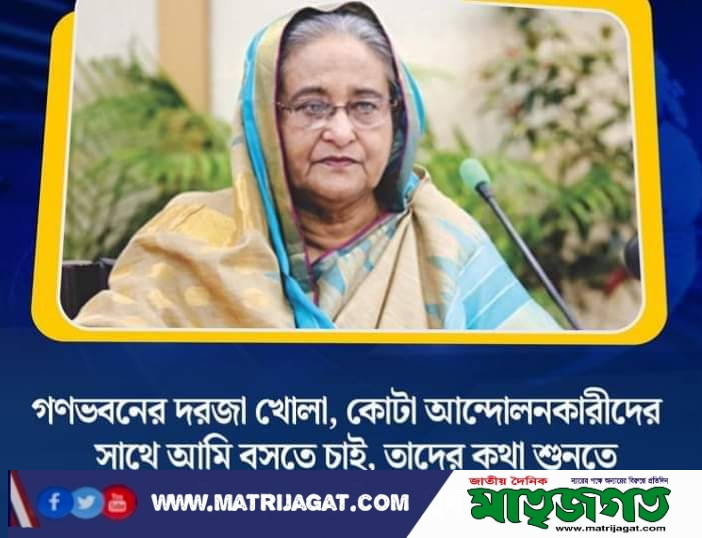 প্রধানমন্ত্রী শেখ হাসিনা বলেছেন, "গণভবনের দরজা খোলা। কোটা আন্দোলনকারীদের সঙ্গে আমি বসতে চাই। তাদের কথা শুনতে চাই। আমি সংঘাত চাই না।"