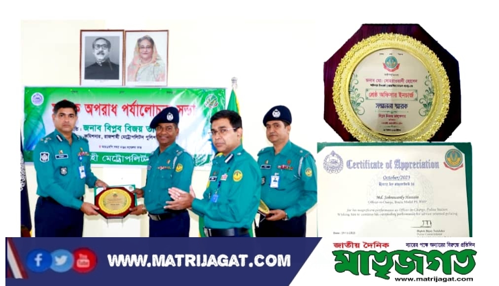 জানা গেছে, আরএমপি বোয়ালিয়া মডেল থানায় অফিসার ইনচার্জ হিসাবে মো: সোহরাওয়ার্দী যোগদানের পর থেকে থানা এলাকায় আইন-শৃঙ্খলা পরিস্থিতি, কিশোর অপরাধ, মাদক উদ্ধার, কমিউনিটি ও বিট পুলিশিং কার্যক্রম জোরদার, গ্রেফতারি পরোয়ানা তামিল, গুরুত্বপূর্ণ মামলা সমূহের অগ্রগতি ও দেশের বর্তমান পরিস্থিতিসহ সমসাময়িক বিভিন্ন বিষয় নিয়ে দিন রাত পরিশ্রম করে যাচ্ছেন। এমন ভালোকাজ তার জুলাই মাসেও অব্যহত ছিলো বোয়ালিয়া মডেল থানায় অফিসার ইনচার্জ মো: সোহরাওয়ার্দীর। সেই পরিশ্রম আরো গতিশীল করতে কমিশনার সম্মাননা পুরস্কার তুলে দেন বোয়ালিয়ার ওসি সোহরাওয়ার্দীকে । মাননীয় পুলিশ কমিশনার মহোদয়ের নিকট হতে ক্রেস্ট ও সম্মাননা স্মারক গ্রহণ করেন। বোয়ালিয়া মডেল থানার পক্ষ হতে আন্তরিক শুভেচ্ছা।