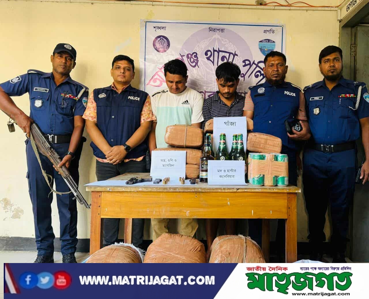 আজ ২৭/১০/২০২৫ খ্রি. তারিখ সকাল ০৮.৩০ ঘটিকায় আশুগঞ্জ থানা পুলিশের একটি টিম থানা এলাকায় গোপন সংবাদের ভিত্তিতে ০১ নং সদর ইউনিয়নের সোনারামপুর এলাকায় অভিযান পরিচালনা করে ০১টি প্রাইভেটকার আটক করে। প্রাইভেটকারটি তল্লাশী করে প্রাইভেটকারের আরোহীদের হেফাজত হতে ক) ০১টি বিদেশী AUTO CAL-7.65 m/m পিস্তল, খ) ০২টি পিস্তলের ম্যাগাজিন সহ ৩০(ত্রিশ) রাউন্ড গুলি, গ) ১১৫ (একশত পনের) কেজি গাঁজা, ঘ) ১২ ক্যান বিদেশী বিয়ার, ঙ) ০৬ (ছয়) বোতল EXCLUSIVE PREMIUM WHISKY উদ্ধার করা হয়। উদ্ধারকৃত মালামাল উপস্থিত সাক্ষীদের সম্মুখে বিধি মোতাবেক জব্দ তালিকা মূলে জব্দ করা হয়।
