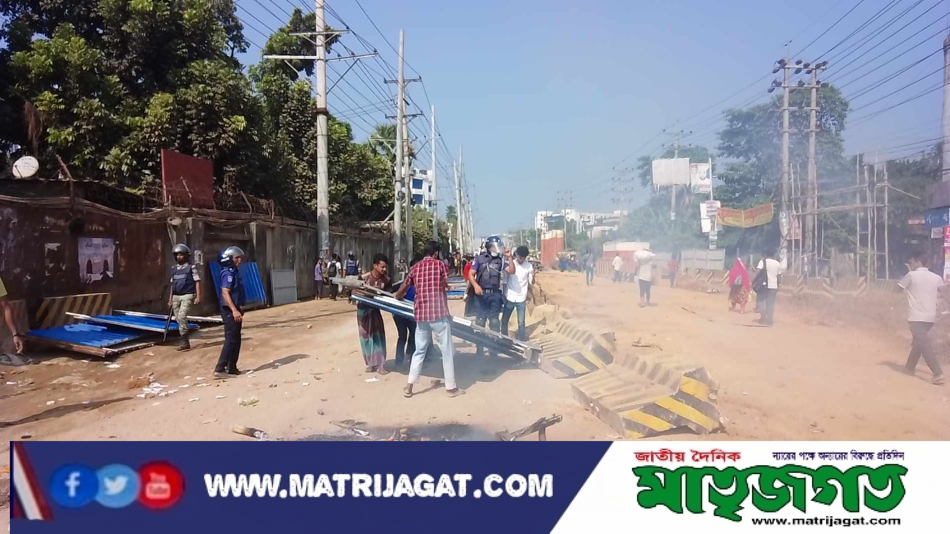 প্রত্যক্ষদর্শীরা জানান, সকালে শ্রমিকরা নুন্যতম বেতন ২৩ হাজার পাঁচশত টাকা বৃদ্ধির দাবীতে কারখানা থেকে সড়কে নেমে আসে সড়ক অবরোধ করে বিক্ষোভ করে। পরে পুলিশ তাদেরকে সড়ক থেকে তুলে দিতে গেলে সংঘর্ষ বাধে।পরিস্থিতি নিয়ন্ত্রণ আনতে পুলিশ টিয়ারগ্যাস ও রাবার বুলেট নিক্ষেপ করে। শ্রমিকরা ছত্রভঙ্গ হয়ে বিভিন্ন অলিগলিতে গিয়ে আশ্রয় নেয়। পরে বেলা ১১ টার দিকে শ্রমিকরা আবারও সড়ক অবরোধ করে।