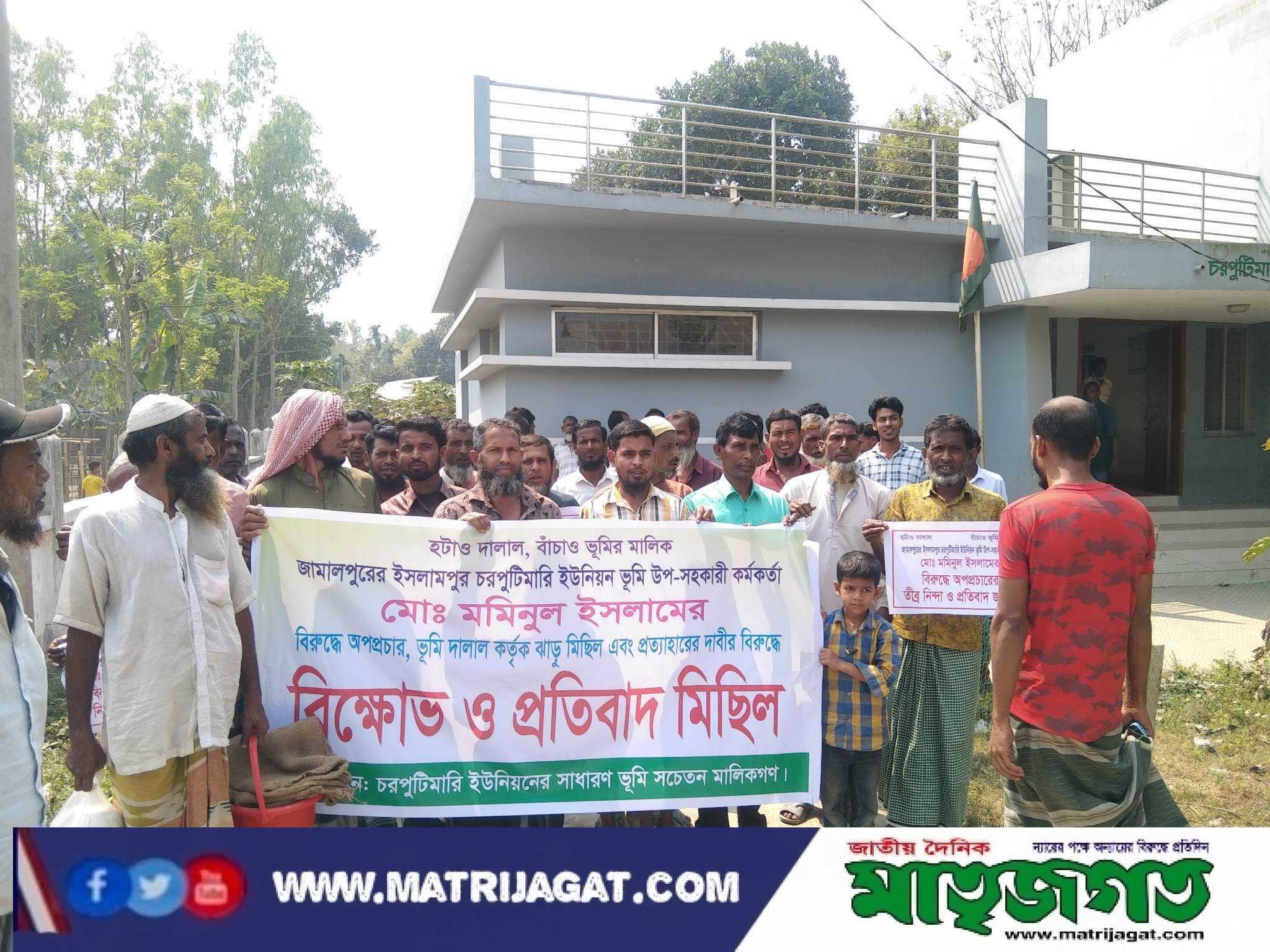 বাচাও ভুমির মালিক" এই স্লোগানে জামালপুরের ইসলামপুর চরপুটিমারি ইউনিয়ন ভূমি উপ-সহকারী কর্মকর্তা মমিনুল ইসলামের বিরুদ্ধে দালালদের অপপ্রচারের প্রতিবাদে উপকার ভোগী সচেতন ভূমির মালিকরা মানববন্ধন, প্রতিবাদ বিক্ষোভ মিছিল করেছে। রবিবার (১২মার্চ)সকালে চরপুটিমারি ইউনিয়ন পরিষদ প্রাঙ্গণে মানববন্ধন শেষে প্রতিবাদ বিক্ষোভ মিছিলটি বেনোয়ারচর বাজার ও এলাকার প্রধান সড়ক প্রদক্ষিণ করে। চরপুটিমারি ইউনিয়ন ভূমি উপ-সহকারী কর্মকর্তা মমিনুল ইসলামসহ স্থানীয় উপকারভোগী ভূমির মালিকরা মানববন্ধন চলাকালে বক্তব্যে বলেন, চরপুটিমারি ইউনিয়ন ভূমি অফিসে ভূমি উপ-সহকারী কর্মকর্তা মমিনুল ইসলাম যোগদান করার পর ভূমি অফিসটিকে দালাল মুক্ত ঘোষণা করায় দালালরা ক্ষিপ্ত হয়ে নায়েবের বিরুদ্ধে মিথ্যা অভিযোগ, ঝাড়ু মিছিলসহ নানান অপপ্রচার করছে। এসময় তারা নায়েবের বিরুদ্ধে অপপ্রচার তীব্র নিন্দা ও প্রতিবাদ জানান এবং অত্র ইউনিয়নের যোগদানের পর ভালো ভূমি সেবা দেওয়ার জন্য সাধারণ ভূমি সচেতন মালিকগণ নায়েব মমিনুল ইসলাম কে ফুলের মাল্য পড়িয়ে সংবর্ধনা দেন।