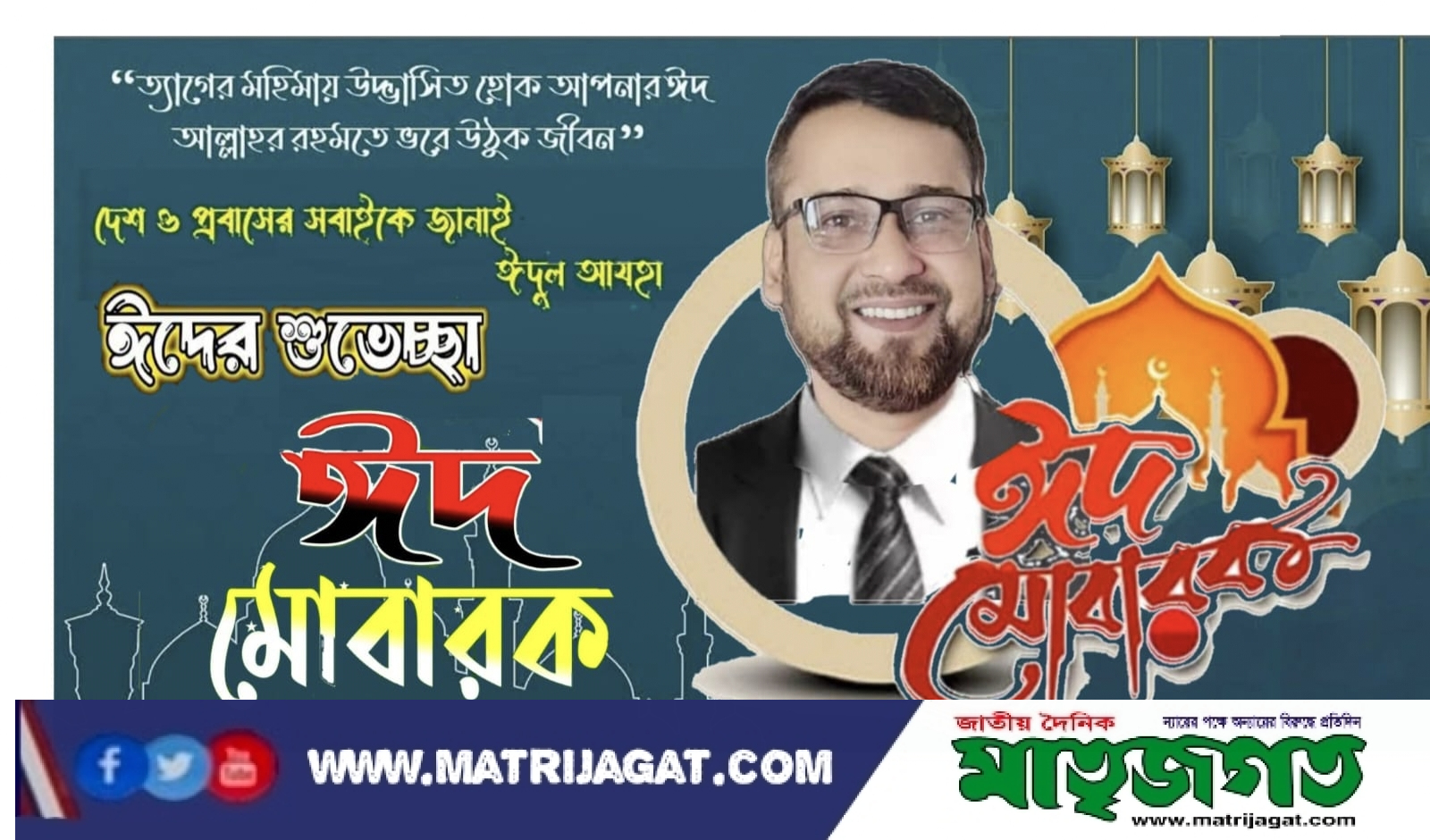 তাকাবাল্লাহু মিনহা ওয়া মিনকুম, পবিত্র ঈদুল-উল-আযহা সকলের জীবনে বয়ে আনুক অনাবিল সুখ শান্তি ও সমৃদ্ধি ত্যাগের মহিমায় উদ্ভাসিত হোক প্রতিটি জীবন দেশ ও প্রবাসে অবস্থানরত সকলকে জানাই পবিত্র ঈদ-উল-আযহার শুভেচ্ছা নির্বাহী সম্পাদক জাতীয় দৈনিক মাতৃজগত পত্রিকার সাংবাদিক মোজাম্মেল হোসেন বাবু ঈদ মুবারক