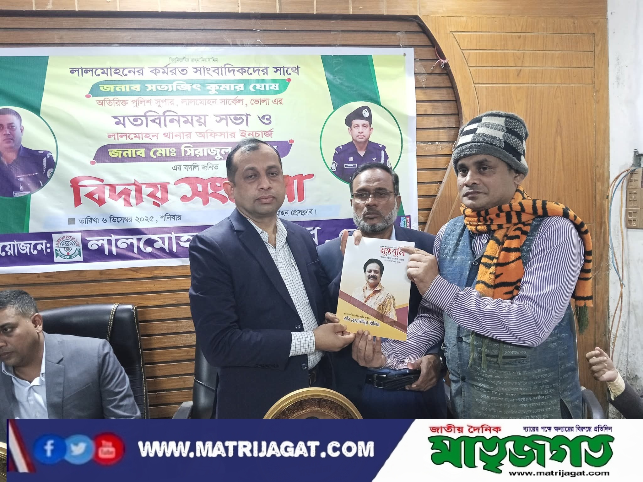 বিশিষ্ট সাংস্কৃতিক ব্যক্তিত্ব ও লালমোহন প্রেসক্লাবের আহবায়ক সোহেল আজিজ শাহীন পাটোয়ারীর সভাপতিত্বে ও লালমোহন প্রেসক্লাবের সদস্য সচিব মোঃ শহিদুল ইসলামের হাওলাদারের স্বাগত বক্তব্য ও দৈনিক ইনকিলাবের লালমোহন প্রতিনিধি এসবি মিলনের সঞ্চালনায় ৬ ডিসেম্বর ২০২৫ সন্ধ্যায় লালমোহন প্রেসক্লাবে অনুষ্ঠিত সংবর্ধনা সভায় গুরুত্বপূর্ণ বক্তব্য রাখেন- দৈনিক মাতৃজগতের ডেপুটি ম্যানেজিং এডিটর ও দৈনিক অমৃতালোকের ফিচার এডিটর কবি রিপন শান এবং দৈনিক ইনকিলাবের ভোলা জেলা প্রতিনিধি শিক্ষাবিদ জহিরুল হক সেলিম ।