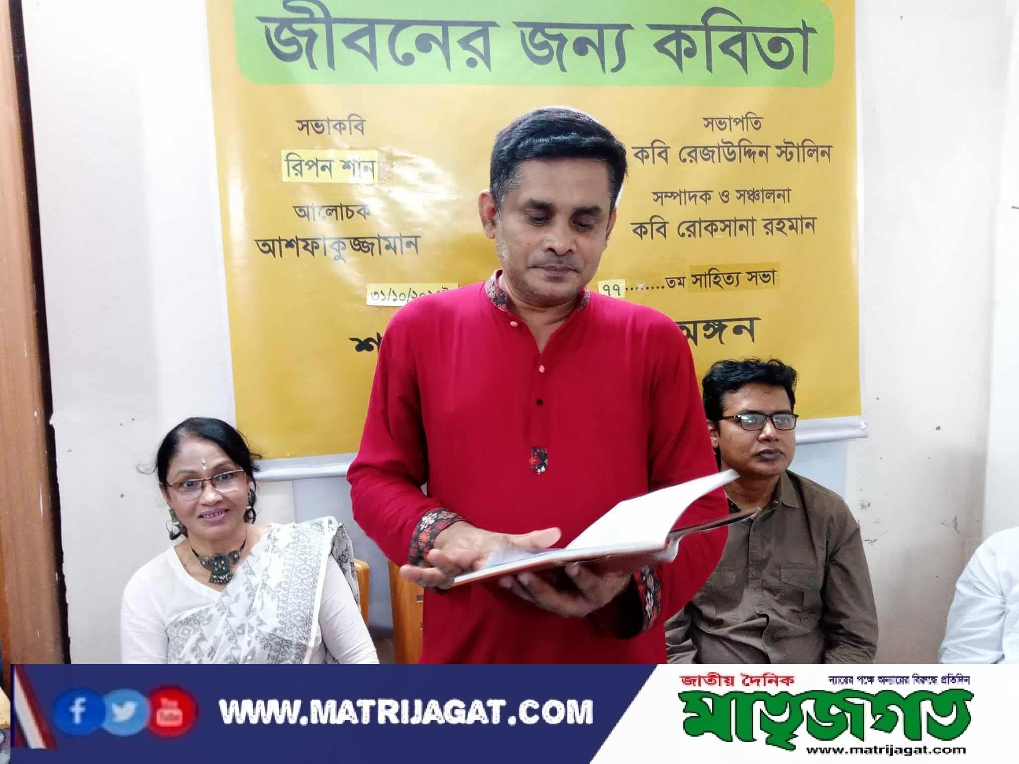 নিজস্ব প্রতিবেদক # মুক্তবুলির প্রধান সম্পাদক, ভয়েস চট্টগ্রামের উপদেষ্টা সম্পাদক, জাতীয় দৈনিক মাতৃজগতের সহ-ব্যবস্হাপনা সম্পাদক, মাতৃজগত টিভির পরিচালক, দৈনিক অমৃতালোকের ফিচার এডিটর, ভোলারকণ্ঠের বিশেষ প্রতিনিধি, রেডটাইমস এর সিনিয়র রিপোর্টার, বজ্রকণ্ঠ ডটকমের গ্লোবাল করেসপন্ডেন্ট বহুমাত্রিক লেখক প্রভাষক কবি রিপন শান কে নিয়ে এক জমজমাট সাহিত্য আড্ডা উপহার দিয়েছে সময়ের সৃজনশীল সংগঠন শব্দকুঠি সাহিত্য অঙ্গন । ৩১ অক্টোবর ২০২৫ শুক্রবার সন্ধ্যায় রাজধানীর পরিবাগ সংস্কৃতি বিকাশ কেন্দ্রে অনুষ্ঠিত সন্ধ্যায় শব্দকুঠির প্রতিষ্ঠাতা ও সাধারণ সম্পাদক কবি রোকসানা রহমানের সভাপতিত্ব ও সঞ্চালনায় জমজমাট এই অনুষ্ঠানে কবি রিপন শানের জীবন ও কর্ম নিয়ে গুরুত্বপূর্ণ আলোচনা করেন- ঢাকা কলেজের বাংলা বিভাগের সহযোগী অধ্যাপক গবেষক কবি রাশেদ চৌধুরী, ম্যাজিক লণ্ঠন সম্পাদক কবি ডক্টর লিন্ডা আমিন, প্রজন্ম একাডেমির সভাপতি কথাসাহিত্যিক কালাম ফয়েজী, বাংলাদেশ রোদসী কৃষ্টিসংসারের মহাসচিব ব্যারিস্টার কবি সাদিয়া আরমান, দৈনিক পূর্বাভাসের ভারপ্রাপ্ত সম্পাদক কলামিস্ট মোমিন মেহেদী । কবিতা পাঠে অংশগ্রহণ করেন- কবি চাষী আব্দুল হক, কবি মতিয়ারা চৌধুরী মিনু, কবি শেলি সেলিনা, কবি শান্তা ফারজানা, কবি আবদুল মান্নান, কবি দিপাশ আনোয়ার, কবি ইশরাত শিউলী , শিশুসাহিত্যিক শাহাবউদ্দিন শামীম সহ শব্দকুঠির একঝাঁক সদস্য কবিগণ । কবি রিপন শানের নদীর বুকে জীবন জ্বলে কাব্যগ্রন্থ থেকে বেশ কয়েকটি কবিতা আবৃত্তি করেন কবির অকৃত্রিম বন্ধু ব্যারিস্টার সাদিয়া আরমান । শুভেচ্ছা নিবেদন করেন- মাধূর্য প্রকাশনীর ব্যবস্থাপনা পরিচালক প্রকাশক হাফেজ নুরুজ্জামান । নদীর বুকে জীবন জ্বলে, ফিনিক্স পাখির উড়াল, রত্নখচিত কুয়াশা এবং (প্রকাশিতব্য)- শিল্পের আলাপ, কবিতা-কলাপ, আট বেহেশতের সুবাস , অপার বিস্ময়, শানিত ত্রিনাট এর লেখক রিপন শান সম্পর্কে বক্তাগণ বলেন- শিল্প সংস্কৃতি ও সমাজকর্মের এক আত্মনিবেদিত প্রতিভার নাম রিপন শান । একসময় রাজধানীতে আলো ছড়িয়েছেন, এখন দ্বীপজেলা ভোলা তথা দক্ষিণ বাংলায় আলো ছড়াচ্ছেন । শব্দকুঠি সাহিত্য অঙ্গন নদীমাতৃক এই কবিকে সম্মানিত করে নিজেরাই সম্মানিত হলো । অনুষ্ঠানে আড্ডার মধ্যমণি কবি রিপন শানের হারিয়ে যাওয়া পরাণপাখি ১১ বছর বয়সী একমাত্র সন্তান খাদিজা রওশান রোদসীর বিদেহী আত্মার মাগফেরাত কামনায় এক মিনিট নীরবতা পালন করা হয় । আসরে দুই ধাপে কবি রিপন শান ভিন্ন ভিন্ন স্বাদের আটটি কবিতা পরিবেশন করেন। তাঁর গাওয়া গান দিয়ে শেষ হয় শব্দকুঠির ৭৭ তম বর্ণিল আসর ।