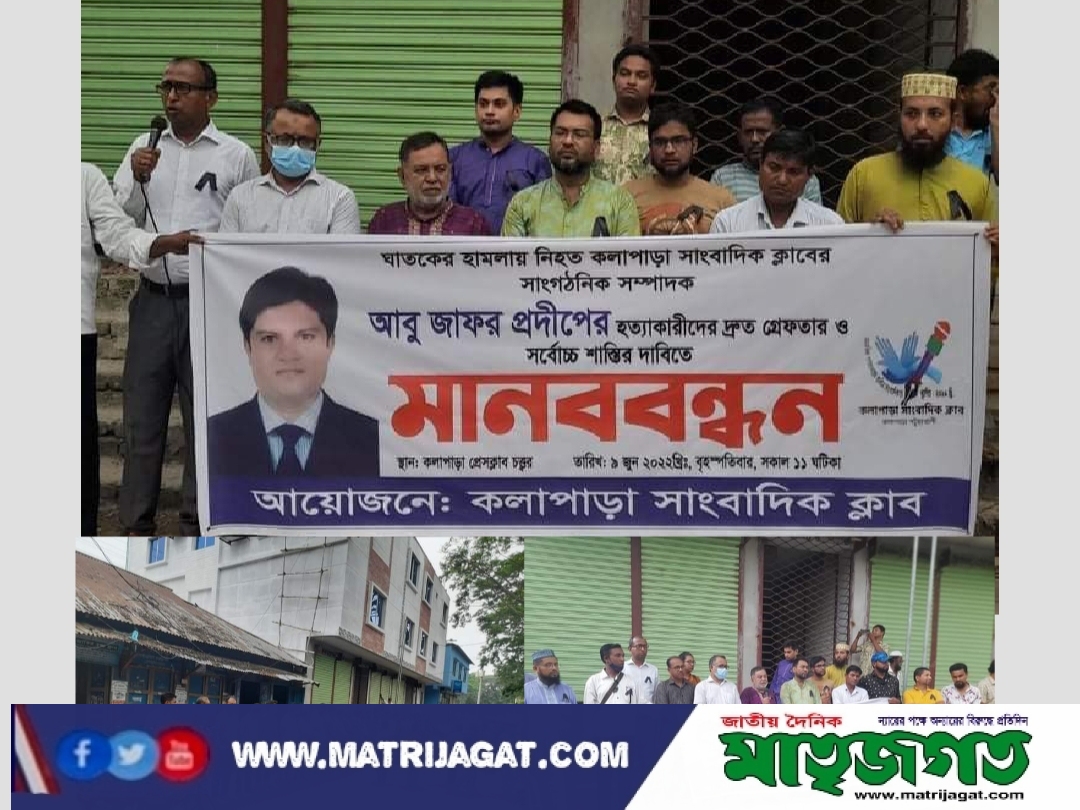 পটুয়াখালীর কলাপাড়ায় সাংবাদিক আবু জাফর প্রদীপ হত্যাকাণ্ডের প্রতিবাদে কলাপাড়া সাংবাদিক ক্লাবের আয়োজনে হত্যাকারীদের দ্রুত গ্রেফতার ও বিচারের দাবিতে বৃহস্পতিবার সকাল ১১ টায় কলাপাড়া প্রেসক্লাব চত্বরে মানববন্ধন ও সমাবেশ কর্মসূচি পালিত হয়েছে।