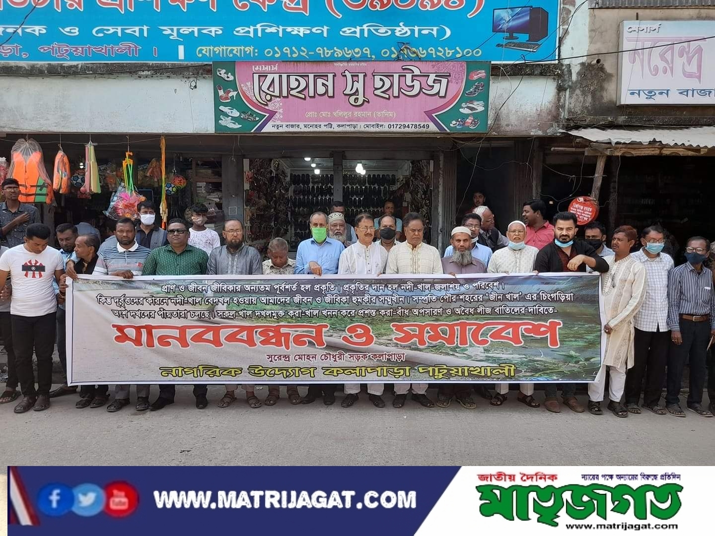 বিশেষ প্রতিনিধিঃ পটুয়াখালীর কলাপাড়ায় পৌরশহরের চিংগড়িয়া আওতাভুক্ত জ্বীন খালটির বন্দোবস্ত্ম বাতিল করে জনগনের জন্য উন্মুক্ত করার দাবীতে বৃহস্পতিবার বেলা ১০ টার দিকে 'নাগরিক উদ্যোগ' কলাপাড়া শাখার আয়োজনে স্থানীয় সুরেন্দ্রমোহন চৌধুরী সড়কের মনোহরীপট্রিতে এক মানববন্ধন ও সমাবেশ অনুষ্ঠিত হয়েছে। বাংলাদেশের কমিউনিষ্ট পার্টি খেপুপাড়া শাখার সাধারন সম্পাদক কমরেড নাসির তালুকদারের সভাপতিত্বে এতে বক্তব্য দেন,কলাপাড়া উপজেলা পরিষদের চেয়ারম্যান এস,এম রাকিবুল আহসান, আ'লীগ উপজেলা শাখার সাধারন সম্পাদক ও সাবেক উপজেলা পরিষদের চেয়ারম্যান আবদুল মোতালেব তালুকদার, সাবেক উপজেলা পরিষদের চেয়ারম্যান মোস্ত্মাফিজুর রহমান,ন্যাপ নেতা খান মতিউর রহমান,উপজেলা আ'লীগের সহ-সাধারন মো.মঞ্জুরম্নল ইসলাম,প্রভাষক রফিকুল ইসলাম,খেপুপাড়া বালিকা মাধ্যমিক বিদ্যালয়ের প্রধান শিক্ষক মো.আনোয়ার হোসেন, নবনির্বাচিত টিয়াখালী ইউনিয়ন পরিষদের চেয়ারম্যান ও কলাপাড়া উপজেলা ছাত্রলীগের সাবেক সভাপতি মো.মাহমুদুল হাসান সুজন মোল্লা,পৌরসভার ৪ নং ওয়ার্ডের কাউন্সিলর খাইরুল হাসানাত খালিদ খান,হিন্দু বৌদ্ধ খৃীষ্টান ঐক্য পরিষদের উপজেলা শাখার সাংগঠনিক সম্পাদক উত্তম চন্দ্র দাস প্রমূখ।