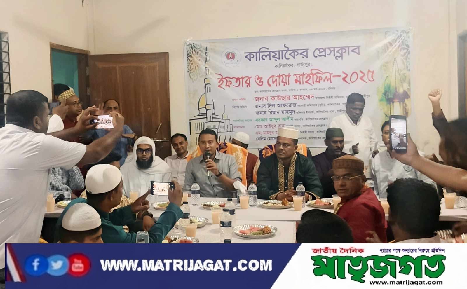 জুয়েল হোসেন স্টাফ রিপোর্টার: গাজীপুরের কালিয়াকৈর উপজেলার মকিষবাথান এলাকায় কালিয়াকৈর প্রেসক্লাবের উদ্যোগে রবিবার প্রেসক্লাব ভবনে এক ইফতার ও দোয়া মাহফিলের আয়োজন করা হয়। প্রেসক্লাবের সভাপতি সরকার আব্দুল আলিমের সভাপতিত্বে অনুষ্ঠিত ইফতার ও দোয়া মাহফিলে প্রধান অতিথি হিসেবে উপস্থিত ছিলেন কালিয়াকৈর উপজেলা নির্বাহী কর্মকর্তা কাউছার আহম্মেদ। বিশেষ অতিথি হিসেবে উপস্থিত ছিলেন কালিয়াকৈর থানা অফিসার ইনচার্জ রিয়াদ মাহমুদ।