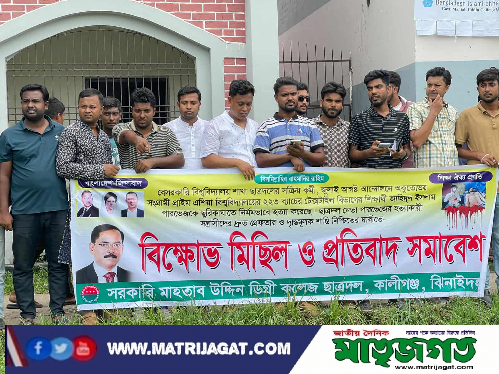 ঝিনাইদহ কালীগঞ্জে বেসরকারি বিশ্ববিদ্যালয় শাখা ছাত্রদলের সক্রিয় কর্মী, প্রাইম এশিয়া বিশ্ববিদ্যালয়ের ২২৩ ব্যাচের টেক্সটাইল বিভাগের শিক্ষার্থী জাহিদুল ইসলাম পারভেজকে ছুরিকাঘাতে নির্মমভাবে হত্যা করেছে। ছাত্রদল নেতা পারভেজের হত্যাকারী সন্ত্রাসীদের দ্রুত গ্রেপ্তার ও দৃষ্টান্তমূলক শাস্তি নিশ্চিতের দাবিতে সরকারি মাহাতাব উদ্দিন কলেজ ছাত্রদলের আয়োজনে বিক্ষোভ মিছিল ও প্রতিবাদ সমাবেশ অনুষ্ঠিত হয়। ২১ শে এপ্রিল সোমবার সকাল ১১টার সময় সরকারি মাহতাব উদ্দিন কলেজ প্রাঙ্গনে প্রাইম এশিয়া বিশ্ববিদ্যালয়ের ২২৩ ব্যাচের টেক্সটাইল বিভাগের শিক্ষার্থী জাহিদুল ইসলাম পারভেজকে ছুরিকাঘাতে নির্মমভাবে হত্যা করার প্রতিবাদে বিক্ষোভ মিছিল ও প্রতিবাদ সমাবেশ কর্মসূচি শুরু হয়।