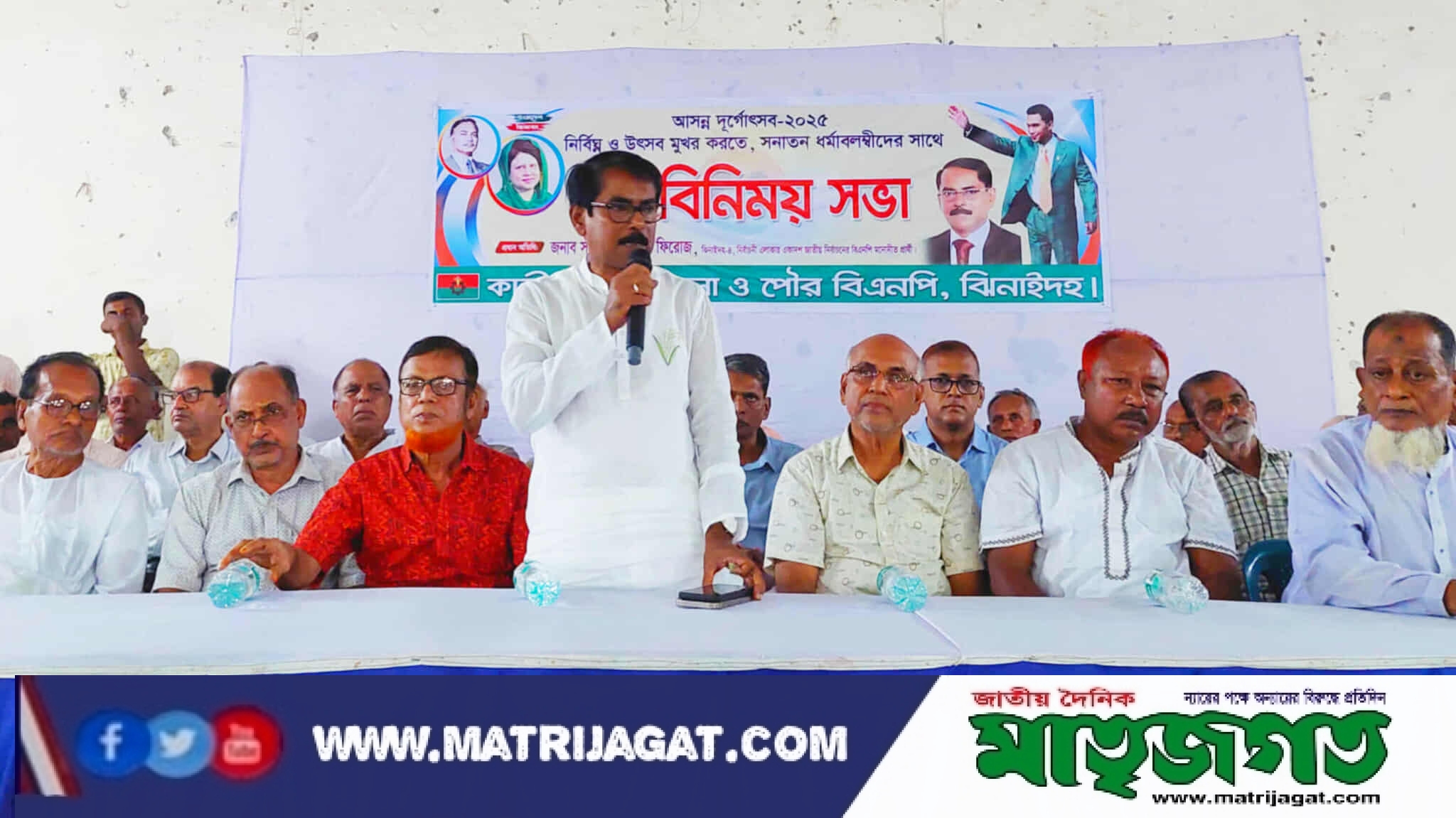 আসন্ন শারদীয়া দুর্গাপূজা উদযাপন নির্বিঘ্ন ও উৎসব মুখর করতে সনাতন ধর্মাবলম্বীদের সাথে ঝিনাইদহের কালীগঞ্জে মতবিনিময় সভার আয়োজন করা হয়। কালীগঞ্জ উপজেলা ও পৌর বিএনপি আয়োজিত এই সম্প্রীতি সভায় সনাতন ধর্মালম্বী সম্প্রদায়ের প্রতিনিধি, রাজনৈতিক ও সামাজিক সংগঠনের নেতৃবৃন্দ অংশ গ্রহন করেন।