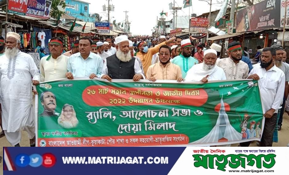 মোঃ ইলিয়াস শেখ বিশেষ প্রতিনিধিঃ পর্যটন নগরী কুয়াকাটায় যথাযত মর্যাদায় মহান স্বাধীনতা দিবস পালিত হয়েছে। সকাল ৯টায় জাতীয় সংগীতের মধ্যদিয়ে জাতীয় ও দলীয় পতাকা উত্তোলন, বঙ্গবন্ধুর প্রতিকৃতিতে পুস্পমাল্য দিয়ে শ্রদ্ধা নিবেদন করা হয়। দিবসটি উপলক্ষ্যে কুয়াকাটা পৌর আওয়ামী লীগের সভাপতি আঃ বারেক মোল্লার নেতৃত্বে বিশাল এক শোভাযাত্রা বের করা হয়। শোভাযাত্রাটি কুয়াকাটা পৌর শহরের প্রধান প্রধান সড়ক প্রদক্ষিন শেষে পৌর আওয়ামী লীগ অফিসে এক আলোচনা সভায় মিলিত হয়। পৌর আওয়ামী লীগ সভাপতি আঃ বারেক মোল্লার সভাপতিত্বে আয়োজিত আলোচনা সভায় বক্তব্য রাখেন, পৌর আওয়ামী লীগ সিনিয়র সহ সভাপতি মোঃ পান্না হাওলাদার, সহ সভাপতি পৌরসভার ২ নং ওয়ার্ড কাউন্সিলর মোঃ তৈয়বুর রহমান, সাংগঠনিক সম্পাদক মাহবুব আলম আকন, পৌর যুব লীগের আহবায়ক মোঃ ইসাহাক শেখ,পৌর শ্রমীক লীগ সভাপতি মোঃ আব্বাস কাজী,কুয়াকাটা পৌর সেচ্ছাসেবক লীগের সাংগঠনিক সম্পাদক ইলিয়াস শেখ,৮ নং ওয়ার্ড আওয়ামী লীগ সভাপতি মোঃ আনোয়ার হোসেন, ৫ নং ওয়ার্ড আওয়ামী লীগ সভাপতি মোশারেফ আকন, পৌর ছাত্রলীগ সভাপতি মোঃ মজিবর রহমান প্রমুখ। আলোচনা সভা শেষে ৭৫ এ ঘাতকের বুলেটের আঘাতে নিহত বঙ্গবন্ধু এবং তার পরিবার ও স্বাধীনতা যুদ্বে সকল শহীদদের রুহ্নের মাগফেরাত কামনা করে দোয়া মোনাজাত করা হয়। মোনাজাত শেষে ৫ শতাধিক মানুষের মাঝে তবারক বিতরণ করেন। অনুষ্ঠান স ালনা করেন পৌর আওয়ামী লীগের যুগ্ম সাধারণ সম্পাদক অনন্ত মুখার্জী। এসময় র্যালী ও আলোচনা সভায় আওয়ামী লীগ, শ্রমিক লীগ,সেচ্ছাসেবক লীগ, যুবলীগ, ছাত্রলীগ সহ বিভিন্ন অংগ সংগঠনের পাঁচ শতাধিক নেতাকর্মিরা উপস্থিত ছিলেন। অপরদিকে কুয়াকাটা পৌরসভার মেয়র মোঃ আনোয়ার হাওলাদারের নেতৃত্বে একটি র্যালী বের করা হয়। র্যালী শেষে এক আলোচনা সভার আয়োজন করা হয়। আলোচনা সভায় বক্তব্য রাখেন পৌর মেয়র আনোয়ার হাওলাদার, প্যানেল মেয়র মোঃ মনির শরীফ,কাউন্সিলর আবুল হোসেন ফরাজী, মোঃ শহিদ দেওয়ান, মোঃ ফজলুল হক খান প্রমুখ। আলোচনা সভা শেষে বিশেষ দোয়া মোনাজাতের আয়োজন করা হয়। অন্যদিকে ট্যুরিস্ট পুলিশ, মহিপুর থানা পুলিশ, মহিপুর পৌর আওয়ামী লীগ, লতাচাপলী পৌর আওয়ামী লীগ, মহিপুর থানা যুবলীগ, কুয়াকাটা বঙ্গবন্ধু মাধ্যমিক বিদ্যালয়, ৬০ নং লতাচাপলী সরকারী প্রাথমিক বিদ্যালয়, মহিপুর মাধ্যমিক বিদ্যালয়, কুয়াকাটা খানাবাদ কলেজ, মুক্তিযোদ্ধা মেমোরিয়াল ডিগ্রি কলেজ, আলহাজ¦ জালাল উদ্দিন ডিগ্রি কলেজ সহ বিভিন্ন সংগঠন ও শিক্ষা প্রতিষ্ঠানের শিক্ষক শিক্ষার্থীরা দিবসটি উপলক্ষে র্যালী ও আলোচনা সভার আয়োজন করে।