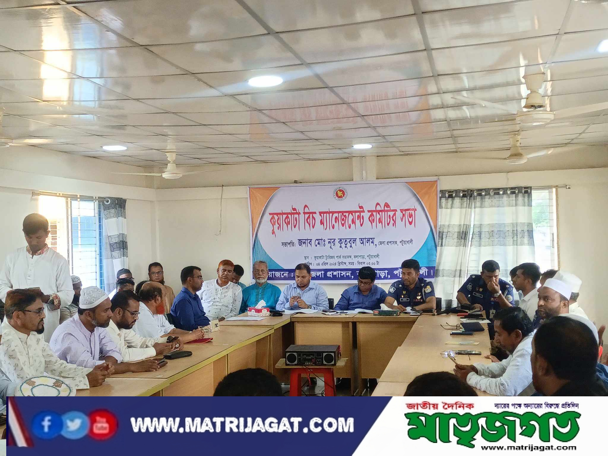 বৃহস্পতিবার ০৪ এপ্রিল বিকেলে কুয়াকাটা জেলা পরিষদ ( ডিসি)বাংলো তে, কলাপাড়া উপজেলা প্রশাসনের আয়োজনে এ সভা অনুষ্ঠিত হয়। কুয়াকাটা বিচ ম্যানেজমেন্ট কমিটির সভাপতি ও জেলা প্রশাসক মোঃ নূর কুতুবুল আলম এর সভাপতিত্বে এ সময় উপস্থিত ছিলেন উপজেলা নির্বাহী অফিসার মোঃ রবিউল ইসলাম, উপজেলা চেয়ারম্যান এস,এম রাকিবুল আহসান,কুয়াকাটা পৌর মেয়র মোঃ আনোয়ার হাওলাদার, টুরিস্ট পুলিশ এর সহকারী পুলিশ সুপার আবুল কালাম আজাদ,কুয়াকাটা খানাবাদ ডিগ্রি কলেজ’র অধ্যক্ষ গ্রুপ লিডার সি এম সাইফুর রহমান, কুয়াকাটা বঙ্গবন্ধু মাধ্যমিক বিদ্যালয়ের প্রধান শিক্ষক গ্রুপ লিডার মোঃ খলিলুর রহমান। মহিপুর কো-অপারেটিভ মাধ্যমিক বিদ্যালয়ের শরীর চর্চা বিষায়ক শিক্ষক ও উপজেলা সদস্য নাসির উদ্দীন,কুয়াকাটা হোটেল মোটেল ওনার্স এসোসিয়েশন এর সাধারন সম্পাদক মোতালেব শরীফ, কুয়াকাটা প্রেস ক্লাবের সহ-সাধারন সম্পাদক আনোয়ার হোসেন আনু, বিজয় টেলিভিশন এর কলাপাড়া উপজেলা প্রতিনিধি হোসাইন আমির,ফটোগ্রাফার সমিতির সাধারন সম্পাদক আল আমিন কাজী, কুয়াকাটার আচার ব্যাবসায়ী,ছাতা চেয়ার ব্যাবসায়ী,ফিস ফ্রাই ব্যাবসায়ী সহ কুয়াকাটার সকল পর্যাটক ব্যাবসায়ীরা।