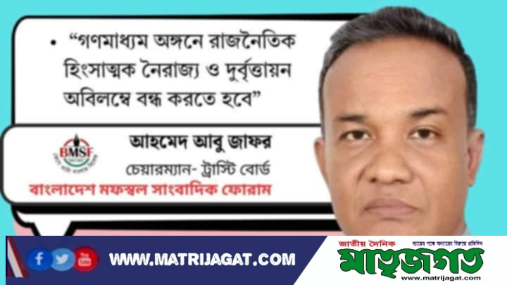 বাংলাদেশ মফস্বল সাংবাদিক ফোরামের (বিএমএসএফ) ট্রাস্টি বোর্ডের চেয়ারম্যান আহমেদ আবু জাফর বলেছেন, “গণমাধ্যম অঙ্গনে রাজনৈতিক হিংসাত্মক নৈরাজ্য ও দুর্বৃত্তায়ন অবিলম্বে বন্ধ করতে হবে।” তিনি বলেন, “সাংবাদিকদের নিরাপত্তা, স্বাধীনতা ও মর্যাদা নিশ্চিত না হলে গণতন্ত্র দুর্বল হয়ে পড়ে এবং রাষ্ট্রে সুশাসন প্রতিষ্ঠা সম্ভব হয় না।” রাষ্ট্রের চতুর্থ স্তম্ভ হিসেবে রাষ্ট্রকে সচল রাখতে গণমাধ্যমকে ন্যায় এবং সঠিক দায়িত্ব পালনে কোনরূপ অসহযোগিতা করা যাবেনা।