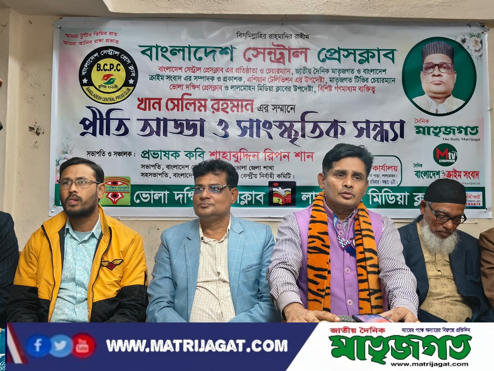 বাংলাদেশ সেন্ট্রাল প্রেসক্লাবের প্রতিষ্ঠাতা ও চেয়ারম্যান, জাতীয় দৈনিক মাতৃজগত ও বাংলাদেশ ক্রাইম সংবাদ এর সম্পাদক ও প্রকাশক, জনপ্রিয় আইপিএ ঢ্যানেল মাতৃজগত টিভির চেয়ারম্যান, এশিয়ান টেলিভিশন, ভোলা দক্ষিণ প্রেসক্লাব ও লালমোহন মিডিয়া ক্লাবের উপদেষ্টা, বিশিষ্ট গণমাধ্যম ব্যক্তিত্ব, নাট্যশিল্পী ও নাট্য পরিচালক, সমাজসেবক খান সেলিম রহমানকে নিয়ে এক দারুণ প্রীতি আড্ডা করেছে- নদীমাতৃক গণমাধ্যম কর্মীদের সংগঠন ভোলা দক্ষিণ প্রেসক্লাব ।