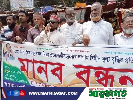 গাইবান্ধা জেলা ব্যুরো প্রধানঃ গাইবান্ধার গোবিন্দগঞ্জে উপজেলা জাতীয় পার্টির উদ্যোগে কেন্দ্রীয় কর্মসূচির অংশ হিসেবে দ্রব্য মূল্যের বৃদ্ধির প্রতিবাদে আজ বুধবা থানা চারমাথা মোড়ে সকাল ১১টায় এক মানব বন্ধন অনুষ্ঠিত হয়েছে।