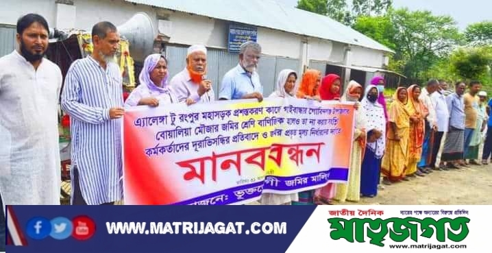 মানববন্ধনে অংশ নেওয়া ক্ষতিগ্রস্ত নিহাদ সুলতানা জানান, বোয়ালিয়া মৌজার জে.এল নং- ২৪১, এস-এ খতিয়ান নং-৪৭৭, দাগ নং-২৬০৭, জমির পরিমাণ ২৭ শতকের মধ্যে ৪ দশমিক ৪০ শতক এল এ কেস নং ০৫/২০১৯-২০২০ মূলে অধিগ্রহণের প্রস্তাব করা হয়। গত ২৩ সেপ্টেম্বর ২০১৯ তারিখে ৪ ধারা নোটিশ জারির সাত দিন পর যৌথ তদন্ত সম্পন্ন হয়। এসময় একই দাগে আমি, আমার বোন শাহিদা জিন্নাত আরা, ভাই আশরাফুলের সহ প্রায় ১৫ শতাংশ জমি বাণিজ্যিক শ্রেণিকরণ করা হয়। সেসময় ওই দাগে সেমি-পাকা দোকান ঘর চুক্তিনামা মূলে ভাড়া প্রদান, ব্যবসা প্রতিষ্ঠানের ট্রেড লাইসেন্স, বাণিজ্যিকহারে বিদ্যুৎ বিল প্রদান, তফশীল জমির খাজনা খারিজ বাণিজ্যিকহারে প্রদান, বাণিজ্যিক হোল্ডিং, ট্যাক্স ও মার্কেন্টাইল ব্যাংকের নিকট মর্গেজ প্রদানের কাগজপত্র উপস্থাপন করা হয়। বিগত ২০১৬ সালের ১২ আগস্ট ব্যাংক সার্ভে এ জমির প্রতি ডেসিমেল মূল্য নির্ধারণ করা হয় ৬ লাখ টাকা। এর পরেও সম্পূর্ণ ইচ্ছাকৃতভাবে এবং মনগড়া অসৎ উদ্দেশ্যে যৌথ তদন্তের পরে ভুয়া রিপোর্ট দাখিল করে আমাদের ক্ষতিগ্রস্ত করা হয়েছে। আমরা এমন কর্মকাণ্ডের তীব্র প্রতিবাদ জানাই। সেই সাথে পুন: তদন্ত সাপেক্ষে নয়ত যৌথ তদন্ত প্রতিবেদন অনুযায়ী আমাদের অবকাঠামো সহ জমির প্রকৃত মূল্য বাণিজ্যিক হারে প্রদানের দাবি জানাচ্ছি।