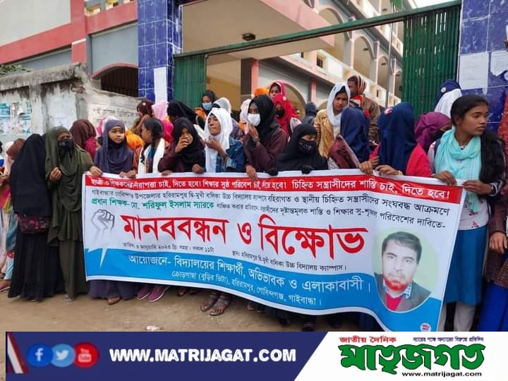 গাইবান্ধা গোবিন্দগঞ্জ উপজেলায় প্রধান শিক্ষককে লাঞ্ছিত করার প্রতিবাদে মানববন্ধন ও বিক্ষোভ।
