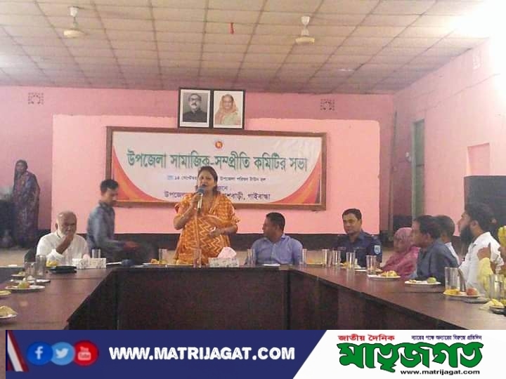 গাইবান্ধা জেলার পলাশবাড়ী উপজেলা প্রশাসনের আয়োজনে উপজেলা সামাজিক সম্প্রীতি কমিটির সভা অনুষ্ঠিত হয়েছে । উপজেলা নির্বাহী অফিসার কামরুজ্জামান নয়নের সভাপতিত্বে সভায় প্রধান অতিথি হিসাবে বক্তব্য রাখেন স্থানীয় জাতীয় সংসদ সদস্য ও বাংলাদেশ কৃষকলীগের সাধারণ সম্পাদক এ্যাড.উম্মেকুলসুম স্মৃতি এমপি।