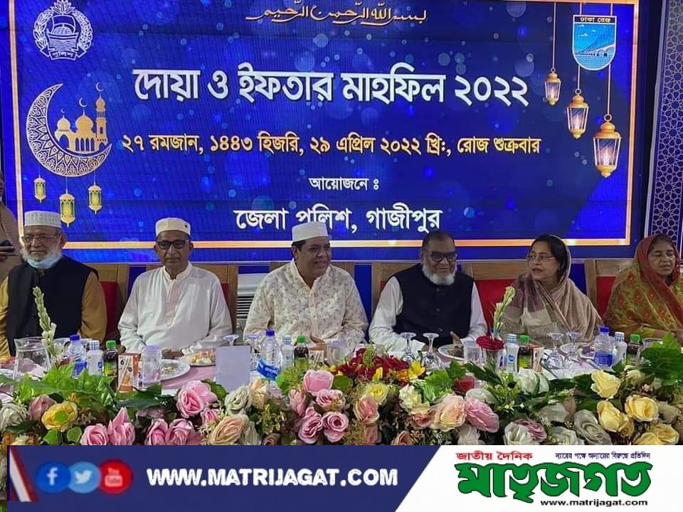 গাজীপুরের জেলা পুলিশের আয়োজনে গাজীপুর পুলিশ লাইন্সে ইফতার দোয়া ও মিলাদ মাহফিল অনুষ্ঠিত হয়েছে। এতে অতিথিদের মধ্যে উপস্থিত ছিলেন মাননীয় মুক্তিযোদ্ধা মন্ত্রী আ ক ম মোজাম্মেল হক এমপি, গাজীপুরের ৩ আসনের মাননীয় সংসদ সদস্য জনাব মোহাম্মদ ইকবাল হোসেন সবুজ এমপি, গাজীপুরের ৪ আসনের মাননীয় সংসদ সদস্য সিমিন হোসেন রিমি এমপি, গাজীপুরের ৫ আসনের মাননীয় সংসদ সদস্য মেহের আফরোজ চুমকি, বাংলাদেশ পুলিশের ঢাকা রেঞ্জের ডিআইজি হাবিবুর রহমান হাবিব।,অতিরিক্ত ডিআইজি নুরে আলম বীনা,গাজীপুরের জেলা প্রশাসক মো. আনিছুর রহমান, গাজীপুরের পুলিশ সুপার এস এম শফিউল্লাহ শফি, গাজীপুর মহানগর আওয়ামীলীগের সভাপতি আজমতউল্লাহ খাঁনসহ গাজীপুরের জেলা আওয়ামীলীগের নেতাকর্মী সুশীল সমাজ