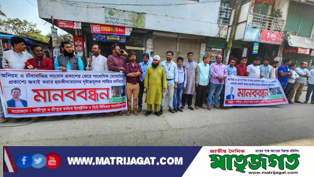 গাজীপুরের শ্রীপুরে অনিয়ম ও চাঁদাবাজির সংবাদ প্রকাশের জেরে সাংবাদিক মোজাহিদকে প্রকাশ্যে জবাই করে হত্যার হুমকির প্রতিবাদে মানববন্ধন অনুষ্ঠিত। শুক্রবার (৭ মার্চ) বেলা সাড়ে ১১টার দিকে শ্রীপুর থানা মোড় এলাকায় স্থানীয় সাংবাদিকরা এ মানববন্ধন করেন।