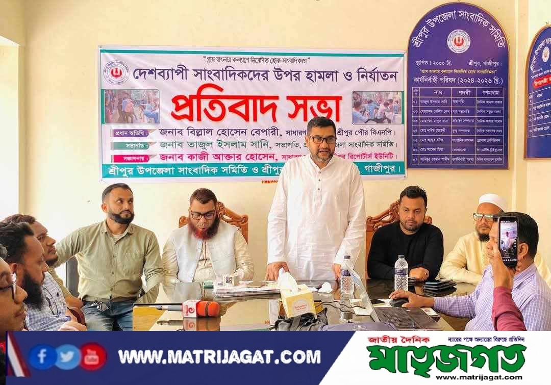 শ্রীপুর উপজেলা সাংবাদিক সমিতির সভাপতি তাজুল ইসলাম সানির সভাপতিত্বে এবং শ্রীপুর রিপোর্টার্স ইউনিটির সাধারণ সম্পাদক কাজী আকতার হোসেনের নেতৃত্বে সাংবাদিকদের উপর হামলা নির্যাতনের প্রতিবাদ সভায় আরো বক্তব্য রাখেন শ্রীপুর উপজেলা সাংবাদিক সমিতির প্রতিষ্ঠাতা রায়হানুল ইসলাম আকন্দ, মোহনা টেলিভিশন ও যায়যায়দিনের প্রতিনিধি প্রভাষক আলফাজ সরকার আকাশ, এশিয়ান টিভির গাজীপুর প্রতিনিধি মাহমুদুল হাসান, শ্রীপুর উপজেলা সাংবাদিক সমিতির সাধারণ সম্পাদক মাসুদ রানা, সাংগঠনিক সম্পাদক আব্দুর রউফ রুবেল, সাবেক সভাপতি আনিছুর রহমান শামীম, সাবেক সাধারণ সম্পাদক সেলিম শেখ, সাবেক সাংগঠনিক সম্পাদক এমদাদুল হক ও আবু সাঈদ, কোষাধ্যক্ষ সাদেক মিয়া, এস এম জরিুল ইসলাম, শ্রীপুর পৌর ছাত্রদলের সদস্য সচিব আজিজুল হক রাজন, দৈনিক আজকের দর্পনের প্রতিনিধি নাজমুল হাসান প্রমুখ।