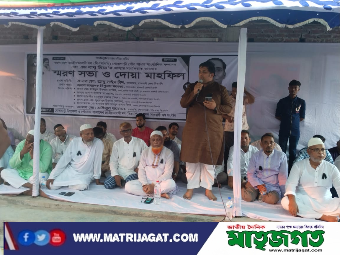 গোদাগাড়ী(রাজশাহী) প্রতিনিধিঃ বাংলাদেশ জাতীয়তাবাদী দল (বিএনপি) গোদাগাড়ী পৌর শাখার সাংগঠনিক সম্পাদক মরহুম এস.এম. বাবু মিয়া'র আত্মার মাগফিরাত কামনায় এক স্মরণ সভা ও দোয়া মাহফিল অনুষ্ঠিত হয়েছে। শুক্রবার বিকেলে গোদাগাড়ী উপজেলা ও পৌর বিএনপি এবং দলের সহযোগী অঙ্গ সংগঠনসমূহ।