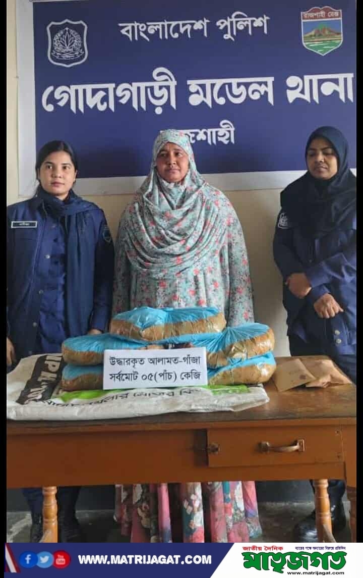 রাজশাহীর গোদাগাড়ী থানা পুলিশের অভিযানে ৫ কেজি গাঁজাসহ এক নারী মাদক ব্যবসায়ীকে আটক করা হয়েছে। বৃহস্পতিবার ২৮ নভেম্বর ২০২৫ সকালে সরমংলা ইকোপার্ক এলাকার নিকট থেকে তাকে গ্রেপ্তার করা হয়।