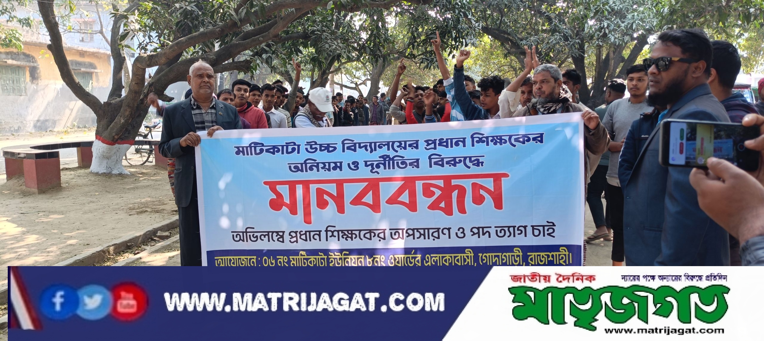 মানববন্ধনে বক্তারা বলেন, মাটিকাটা উচ্চ বিদ্যালয়ের প্রধান শিক্ষক মোসাঃ ইসমত আরা দীর্ঘদিন ধরে বিভিন্ন অনিয়মে লিপ্ত। ষষ্ঠ, অষ্টম এবং নবম শ্রেণির রেজিস্ট্রেশন ফি ও দশম শ্রেণির ফরম পূরণের জন্য অতিরিক্ত অর্থ আদায়ের অভিযোগ রয়েছে তার বিরুদ্ধে। এছাড়া শিক্ষার্থীদের কাছ থেকে পরীক্ষার মূল্যায়ন বাবদ ফি আদায় করা হয়, যা সরকারি নির্দেশনার বাইরে।
