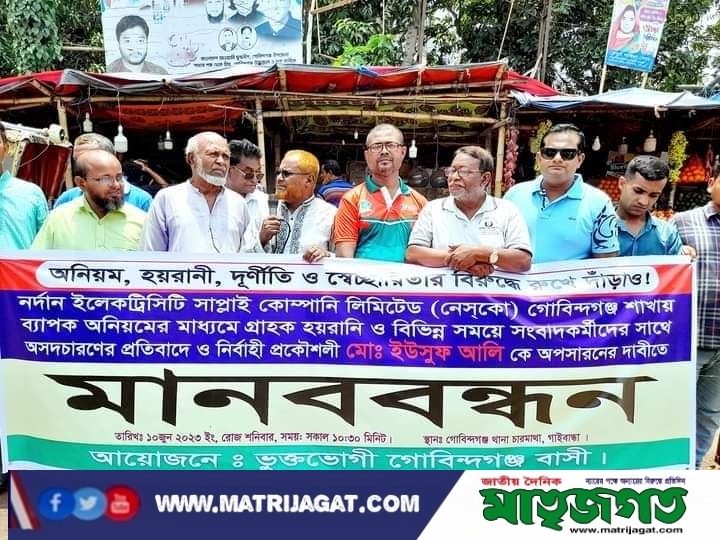 গাইবান্ধা জেলা ব্যুরোঃ গাইবান্ধার গোবিন্দগঞ্জে নেসকো লিমিটেডের বিক্রয় ও বিতরণ বিভাগে ব্যাপক অনিয়ম-হয়রানি-দুর্নীতি ও স্বেচ্ছাচারিতার প্রতিবাদে নির্বাহী প্রকৌশলী মো. ইউসুফ আলীর অপসারণের দাবিতে মানববন্ধন অনুষ্ঠিত হয়েছে।