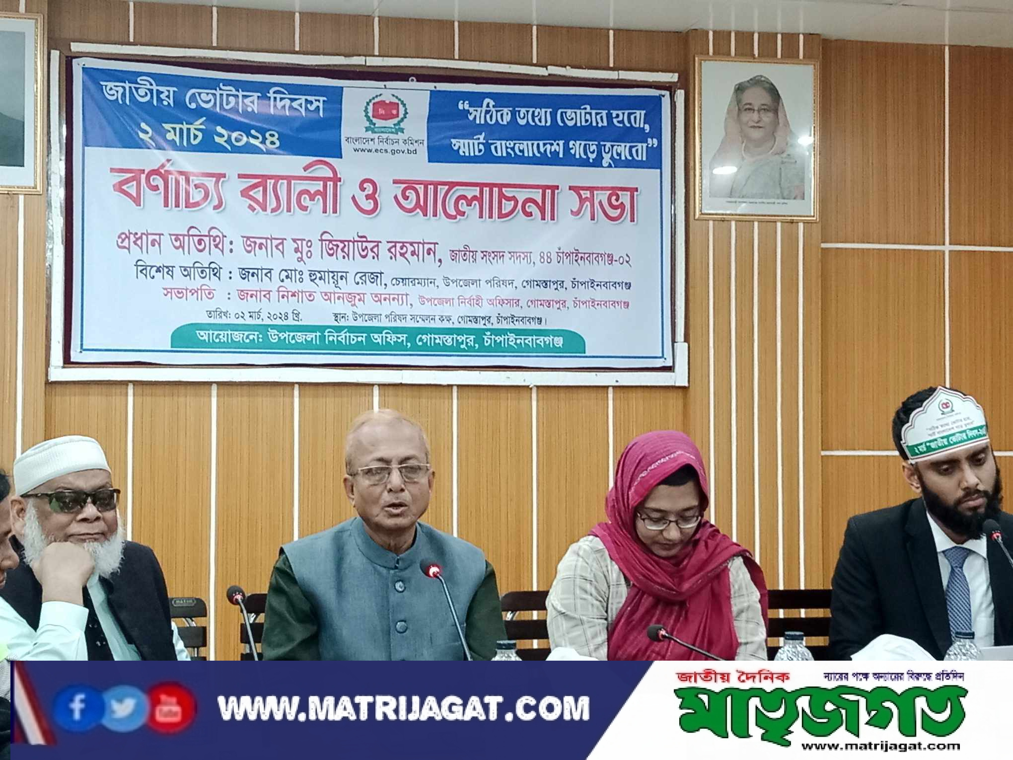 চাঁপাইনবাবগঞ্জের গোমস্তাপুরে জাতীয় ভোটার দিবস, গোমস্তাপুর উপজেলা নির্বাচন অফিসের আয়োজনে দিবসটি যথাযোগ্য মর্যদায় পালিত হয়। শনিবার ২মার্চ (২০২৪) সকাল ৯ টা ৩০ মিনিটে বর্ণনাট্য রালি বের হয়ে বিভিন্ন স্থান প্রদর্শিত হয়ে।উপজেলা চত্বরে শেষ হয় । পরে উপজেলা সভাকক্ষে আলোচনা সভা অনুষ্ঠিত হয়। উক্ত সভায় সভাপতিত্ব করেন,গোমস্তাপুর উপজেলা নির্বাহী অফিসার (ইউ এন ও) জনাব নিশাত আঞ্জুম অনন্যা ,