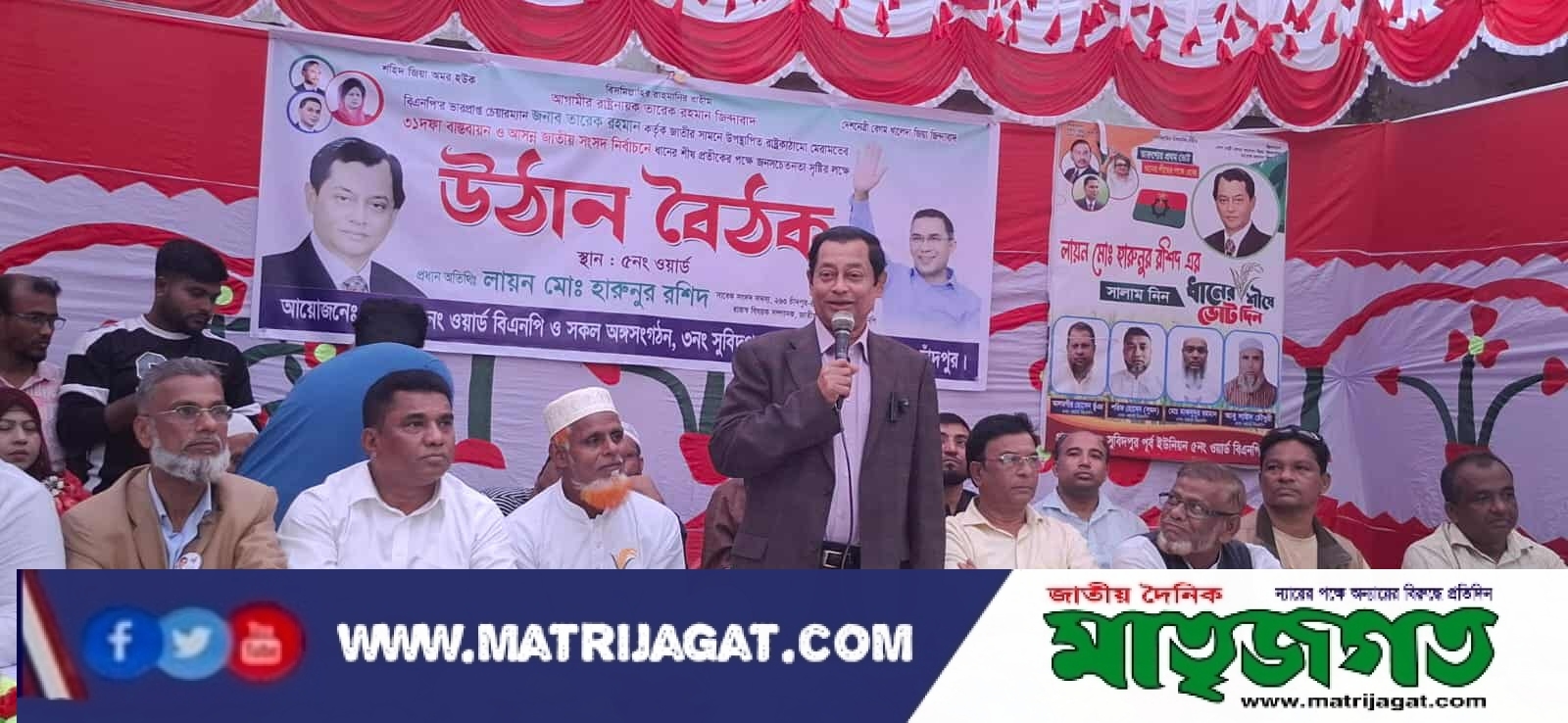 আসন্ন ত্রয়োদশ জাতীয় সংসদ নির্বাচনে চাঁদপুর-৪ (ফরিদগঞ্জ) আসনে বাংলাদেশ জাতীয়তাবাদী দল (বিএনপি) মনোনীত প্রার্থী, সাবেক সংসদ সদস্য এবং বিএনপি জাতীয় নির্বাহী কমিটির ব্যাংকিং ও রাজস্ব বিষয়ক সম্পাদক লায়ন মো. হারুনুর রশিদের সমর্থনে ফরিদগঞ্জ উপজেলার ৩নং সুবিদপুর পূর্ব ইউনিয়নের ৪, ৫ ও ৬নং ওয়ার্ডের উদ্যোগে এক বিশাল উঠান বৈঠক অনুষ্ঠিত হয়েছে।