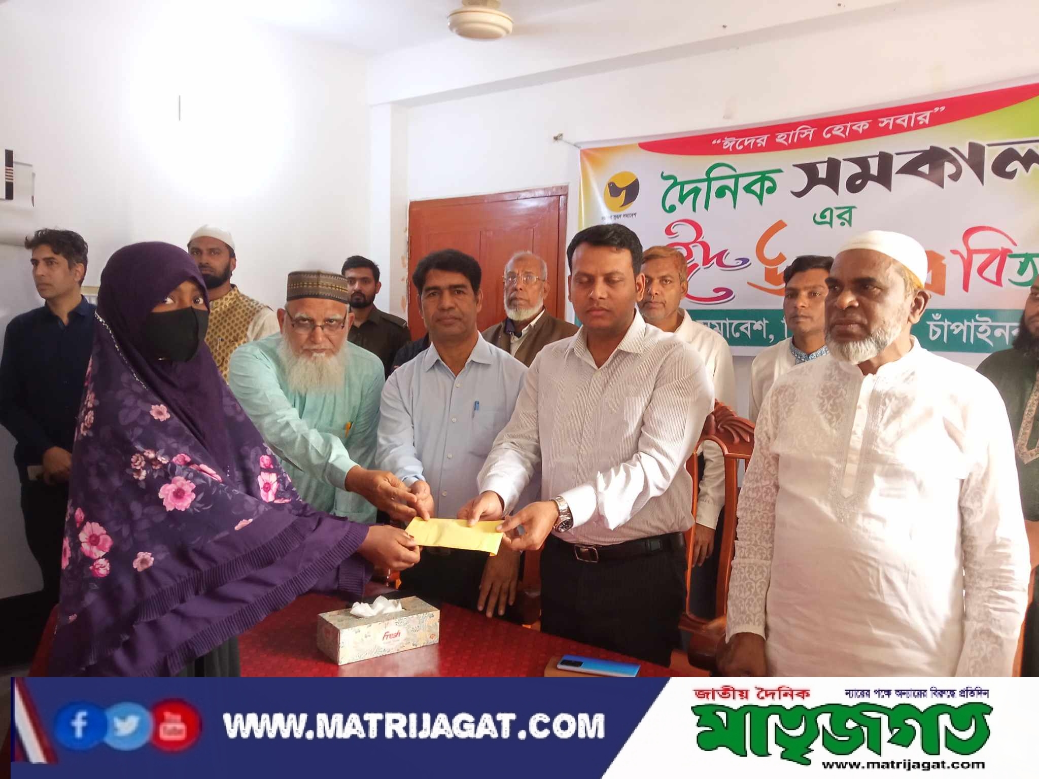 ‘‘ঈদের হাসি হোক সবার” এই প্রতিপাদ্যে- চাঁপাইনবাবগঞ্জের শিবগঞ্জে দেড় শতাধিক অসহায়-দুস্থ পরিবারের মাঝে ‘ঈদ উপহার’ হিসেবে খাদ্যসামগ্রী প্রদান করেছেন সুহৃদরা। বৃহস্পতিবার সকালে উপজেলা প্রবীণ হিতৈষী সংঘের কার্যালয়ে সমকালের জেলা প্রতিনিধি একেএস রোকনের সভাপতিত্বে ঈদ উপহার প্রদানের আয়োজন করে সমকাল সুহৃদ সমাবেশ শিবগঞ্জ ইউনিট। অনুষ্ঠানে প্রধান অতিথি হিসেবে উপস্থিত ছিলেন উপজেলা নির্বাহী কর্মকর্তা মো. আজাহার আলী। এ সময় তিনি বলেন, এটি একটি প্রশসংনীয় উদ্যোগ। প্রতিবছর এমন আয়োজন হলে সমাজের অসহায় ও বিশেষ চাহিদা সম্পন্ন পরিবারের সদস্যরা কিছুটা হলেও ঈদের আনন্দ ভাগাভাগি করে নিতে পারবে। আগামীতে যেন এমন উদ্যোগ অব্যহত রাখবে সুহৃদ সমাবেশ। এদিকে সত্রাজিতপুর ফাজিল মাদ্রাসার শিক্ষার্থী মাহিমা খাতুনকে লেখাপড়ার জন্য এককালিন দশ হাজার টাকা প্রদান করা হয়। একই সঙ্গে তার পিতা অসুস্থ হওয়ায় লেখাপড়া বন্ধের উপক্রম হয়ে যাওয়ায় দাখিল পরীক্ষা পর্যন্ত লেখাপড়ার দায়িত্ব নেয় সুহৃদ সমাবেশের শিবগঞ্জ উপজেলা শাখার উপদেষ্টা বিশিষ্ট ব্যবসায়ী আলমগীর জুয়েল। এছাড়া একই মাদ্রাসার ফাজিল পরীক্ষার্থীকে দেড় হাজার টাকা দেয়া হয়। অন্যদিকে কালুপুর গ্রামের তিন মেয়ের জননী বিধবা নারী জাহানারা বলেন, ‘‘এই ঈদে এখন পর্যন্ত কেহ খোঁজ খবর নেয়নি। সাত রকমের ঈদ সামগ্রী পাওয়ায় ঈদের দিন রান্না করে খাবার খেয়ে আনন্দে কাটাতে পারব’’। অনুষ্ঠানে অন্যদের মধ্যে উপস্থিত ছিলেন উপজেলা প্রকল্প বাস্তবায়ন কর্মকর্তা মিজানুর রহমান, শিবগঞ্জ পৌর বিএনপির আহবায়ক সফিকুল ইসলাম, পৌর জামায়াতের সেক্রেটারী আব্দুর রউফ, উপজেলা প্রবীণ হিতৈষী সংঘের সভাপতি আকবর হোসেন এবং শিবগঞ্জ শিল্প ও বণিক সমিতির সভাপতি ইউসুফ আলী, সুহৃদ সমাবেশ শিবগঞ্জ উপজেলা শাখার উপদেষ্টা আলমগীর জুয়েল, সাইফুল ইসলাম, সভাপতি আবুল কালাম আজাদ, সহ-সভাপতি আজিজুল ইসলাম, সাধারণ সম্পাদক আবদুল বাতেন, দপ্তর সম্পাদক এসএম মহিউদ্দিন, প্রচার সম্পাদক রায়হান আলী, সদস্য ইসরাইল হোসেন ও সদস্য আতিক ইসলাম সিকো প্রমূখ। শেষে অসহায়, রিকশাচালক ও ছিন্নমূল মানুষসহ দুস্থদের তালিকা তৈরি করে তাদের হাতে আনুষ্ঠানিকভাবে ঈদ উপহার তুলে দেওয়া হয়।