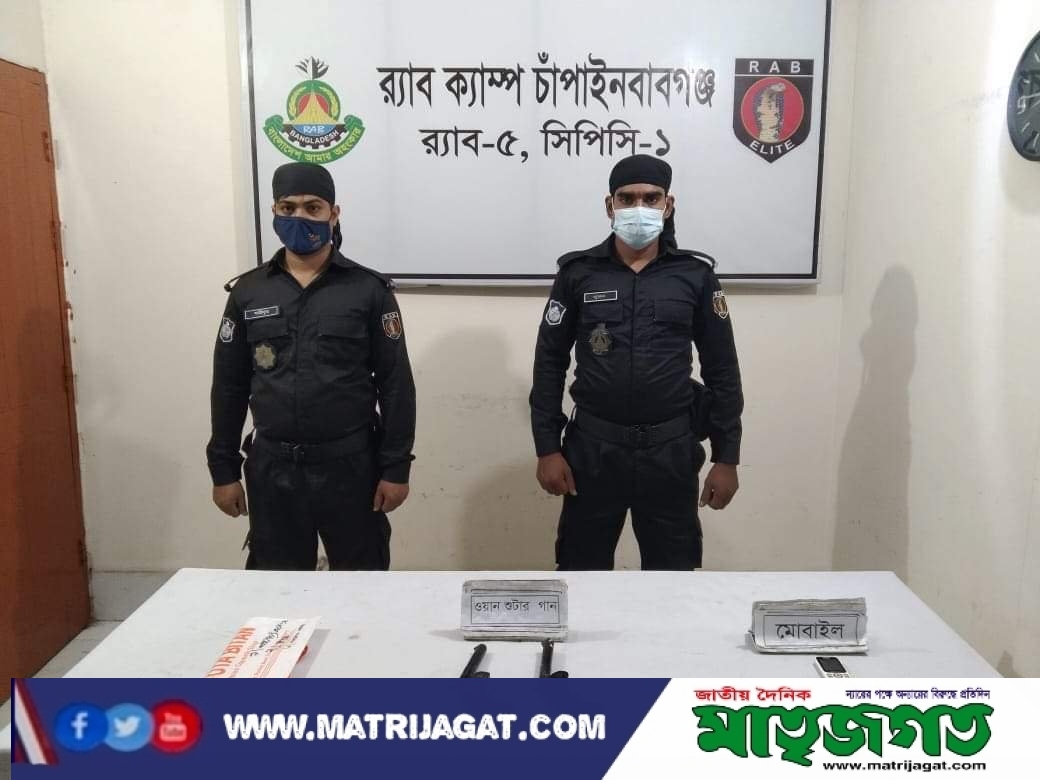 স্টাফ রিপোর্টারঃ সিপিসি-১, চাঁপাইনবাবগঞ্জ ক্যাম্প, র্যাব-৫, রাজশাহীর একটি অপারশন দল ২৭ মার্চ ২০২২ ইং তারিখ ২০:২০ ঘটিকা গোয়েন্দা তথ্যর ভিত্তিত চাপাইনবাবগঞ্জ জেলার শিবগঞ্জ থানাধীন ৬নং কানসাট ইউনিয়নর ১ নং ওয়ার্ডর মেসার্স নয়ন ফিলিং স্টশনর পূর্ব পাশে বাচু মিস্ত্রির গ্যারজ সংলগ্ন জৈনক আফসার আলীর আমবাগানর পূর্ব পাশে থেকেক কোম্পানী অধিনায়ক লে: কমান্ডার রুহ-ফি-তাহমিন তকির এবং কাম্পানী উপ অধিনায়ক অতিরিক্ত পুলিশ সুপার মোঃ জাহিদুল ইসলাম এর নেতৃত্বে একটি অবৈধ অস্ত্র উদ্ধার অভিযান পরিচালনা করে (ক) ওয়ান শুটারগান-০২টি,(খ) মোবাইল সেট-০১টি (গ) সীমকার্ড-০১টিসহ ১। শ্রী সুভাস ভকদ (৩০), পিতা-শ্রী ফাষটা ভকদ, মাতা-শ্রীমতি প্রভাতি ভকদ, সাং-আলীডাঙ্গা (৬নং ওয়ার্ড শিবগঞ্জ পৌরসভা), থানা-শিবগঞ্জ, জেলা-চাপাইনবাবগঞ্জ, থেকে হাতেনাতে গ্রেফতার করা হয়।