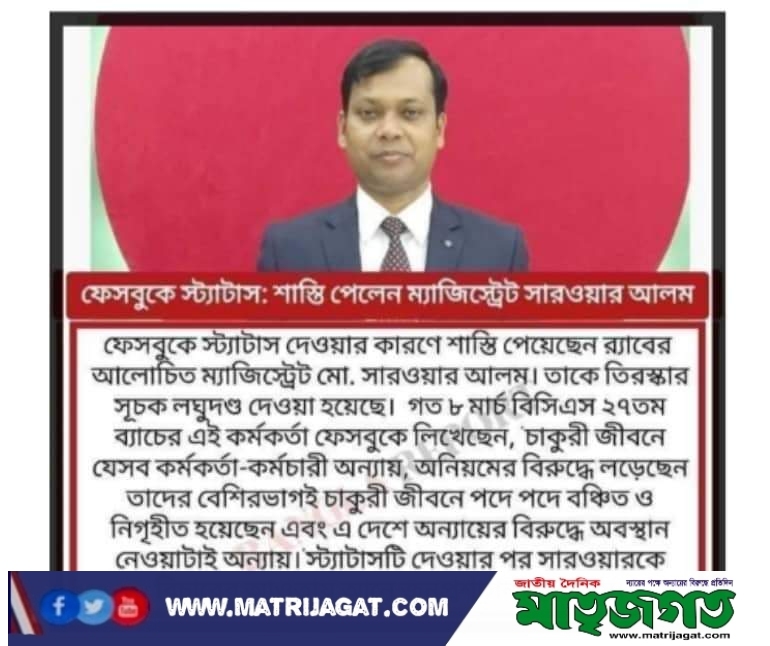 জনপ্রশাসন মন্ত্রণালয় থেকে ‘তিরস্কার’ করা হয়েছে সহকারী সচিব সারওয়ারের ফেসবুক পোস্ট