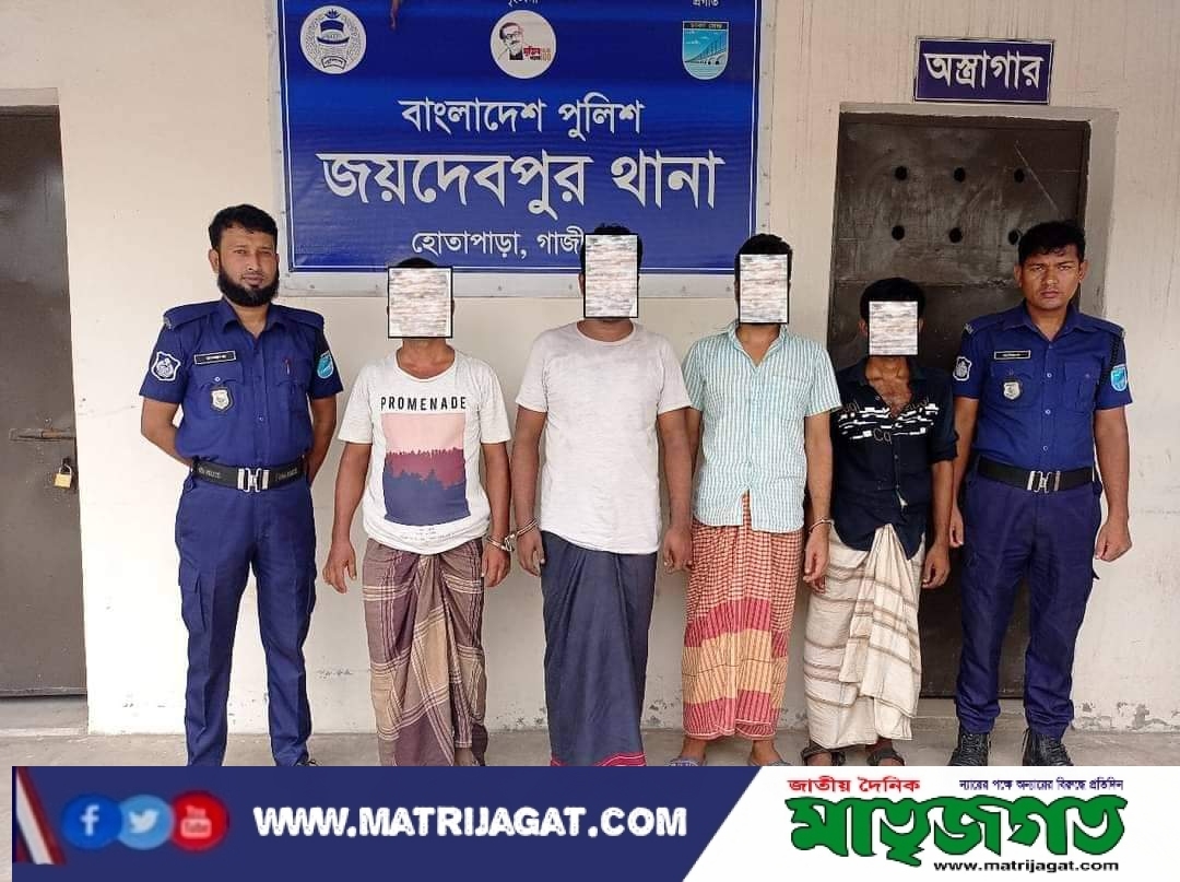 জয়দেবপুর থানার অফিসার ইনচার্জ,জনাব মাহাতাব উদ্দিন এর দিক নির্দেশনায় অত্র থানার এসআই মোঃ মাজহারুল হক সঙ্গীয় ফোর্স সহ মাদকদ্রব্য বিরোধী বিশেষ অভিযান পরিচালনা করিয়া ৪০ (চল্লিশ) পিচ ইয়াবা ট্যাবলেট সহ আটক ৪).১. মোঃ মমিন হোসেন(৪৩) পিতা-মৃত চাঁন মিয়া স্থায়ী: গ্রাম-পাইনশাইল (উত্তর পাড়া) থানা-জয়দেবপুর, জেলা-গাজীপুর,২.মোঃ আমজাদ হোসেন(৩৪), পিতা-মৃত জালাল উদ্দিন স্থায়ী: গ্রাম-পাইনশাইল (উত্তর পাড়া) থানা-জয়দেবপুর,জেলা -গাজীপুর,৩.মোঃ জুলহাস সরকার(৪০) পিতা-মোঃ আনিছুর রহমান @ মুক্তার স্থায়ী: গ্রাম- পাইনশাইল (দক্ষিনপাড়া) থানা- জয়দেবপুর,জেলা গাজীপুর ৪.মোঃ রুবেল মিয়া(২২), পিতা-মোঃ সিরাজ উদ্দিন ,স্থায়ী: গ্রাম-পাইনশাইল (মধ্যপাড়া)থানা-জয়দেবপুর,জেলা -গাজীপুরদেরকে জয়দেবপুর থানাধীন পাইনশাইল সাকিনস্থ মোঃ আনিছুর রহমান @ মুক্তার এর বাড়ীতে,পাইনশাইল হইতে গ্রেফতার করেন।