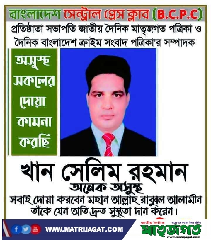 জাতীয় দৈনিক মাতৃজগত পত্রিকা'র সম্পাদক ও বাংলাদেশ সেন্ট্রাল প্রেসক্লাব (বি,সি,পি,সি) কেন্দ্রীয় কমিটি'র প্রতিষ্ঠাতা সভাপতি খান সেলিম রহমান, শারীরিক ভাবে গুরুতর অসুস্থ্য। তার সুস্থতা কামনায় সকলের কাছে দোয়া চেয়েছেন, তার সহধর্মিণী ও জাতীয় দৈনিক মাতৃজগত পত্রিকা'র প্রকাশক আছিয়া রহমান।