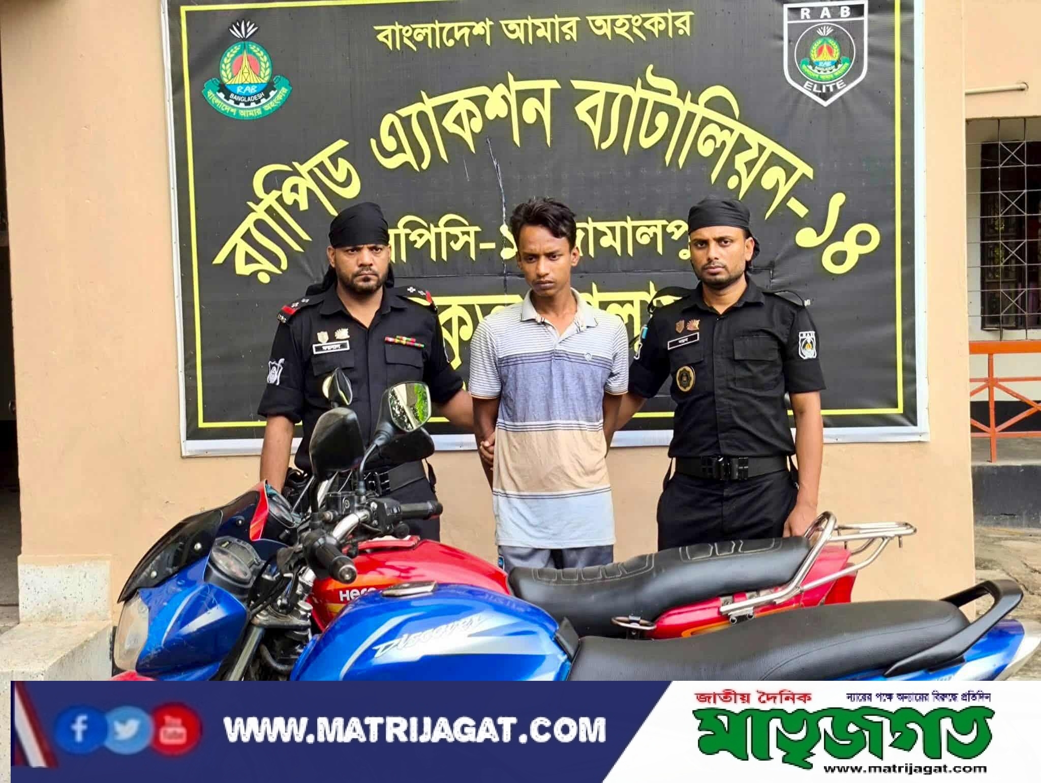 জামালপুর - শেরপুর সহ আশেপাশের জেলাগুলা থেকে আন্তজেলা মোটরসাইকেল চোরচক্রের সদস্যরা বিভিন্ন লোকজনের মোটরসাইকেল চুরি করছিল বলে র্যাব-১৪ এর নিকট গোয়েন্দা তথ্য ছিল। এই তথ্যের ভিত্তিতে মোটরসাইকেল চোর-চক্রের সদস্যদের গ্রেপ্তারের নিমিত্তে গোয়েন্দা তৎপরতা বৃদ্ধি করা হয় এবং চোরদেরকে আইনের আওতায় আনতে অভিযান পরিচালনা করা হয়। র্যাব বরাবরই নিয়মিত অভিযান পরিচালনার মাধ্যমে খুন, ধর্ষণ, ডাকাতি, অপহরণ মামলা'র আসামি গ্রেফতার, জিম্মি উদ্ধার, ভিকটিম উদ্ধার সহ চাঞ্চল্যকর মামলা'র আসামি গ্রেপ্তার, দুর্ধর্ষ সন্ত্রাসী গ্রেপ্তার ও মাদকের বিরুদ্ধে নিয়মিত অভিযান পরিচালনা করে থাকে। এরই পরিপ্রেক্ষিতে সিপিসি-১, র্যাব-১৪, জামালপুর এর একটি আভিযানিক দল অদ্য ২১ আগস্ট রাত ০১.৩০ ঘটিকায় জামালপুর জেলার সদর থানাধীন বেলটিয়া জঙ্গলপাড়া এলাকা হতে রেজিঃ বিহীন ০১টি নীল রংয়ের ডিসকভার মোটরসাইকেল উদ্ধার করে। পরবর্তীতে একাধারে অভিযান পরিচালনা করে অদ্য ২২ আগষ্ট ০০.৩০ ঘটিকার সময় জামালপুর জেলার মেলান্দহ থানাধীন পড়াগুড়ি এলাকা হতে আন্তঃজেলা মোটরসাইকেল চোর চক্রের সক্রিয় সদস্য মোঃ আসাদুল ইসলাম (২৫), পিতা-মৃত আনার মিয়া পাগলা, সাং-মহিরামকুল, থানা-মেলান্দহ, জেলা-জামালপুর কে গ্রেফতারসহ তার নিজ হেফাজত হতে আরো একটি রেজিঃ বিহীন চোরাই হিরো মোটরসাইকেল উদ্ধার করা হয়। গ্রেফতারকৃত আসাদুল'কে জিজ্ঞাসাবাদে জানা যায় সে দীর্ঘদিন যাবৎ চোর চক্রের সক্রিয় সদস্যরাসহ আন্তঃজেলার বিভিন্ন স্থানে মোটরসাইকেল চুরি করে ভিন্ন জেলায় বিক্রয় করে থাকেন। এই চোরচক্রের সদস্যরা জামালপুর সদর, মেলান্দহ সহ অন্যান্য বিভিন্ন জায়গায় বাসা ভাড়া করে থাকে। এক অঞ্চলের একটি মোটরসাইকেল চুরি করে সেখান থেকে তারা অন্য জায়গায় যায় এবং সেই জায়গার ভাড়া বাসায় অবস্থান করে। তারা অধিকাংশ ক্ষেত্রে মাঝারি মানের বা তুলনামূলকভাবে কম দামি মোটরসাইকেল গুলো চুরি করে কারণ সেগুলোতে প্রযুক্তিগত ট্রাকিং ব্যবস্থা থাকে না বলে তারা মনে করে। একটি মোটরসাইকেল চুরির পরে তারা ওই দিনই বা যত দ্রুত সম্ভব মোটরসাইকেলটি কম দামে বিক্রি করে দেয়। খবর নিয়ে আরো জানা যায় যে গ্রেফতারকৃত আসাদুল অত্র চোর চক্রের মূল হোতা হিসেবে এলাকায় সুপরিচিত। গ্রেফতারকৃত আসামীর বিরুদ্ধে পরবর্তী আইনানুগ ব্যবস্থা গ্রহণের জন্য জামালপুর জেলার মেলান্দহ থানায় হস্তান্তর ও মামলার কার্যক্রম প্রক্রিয়াধীন।