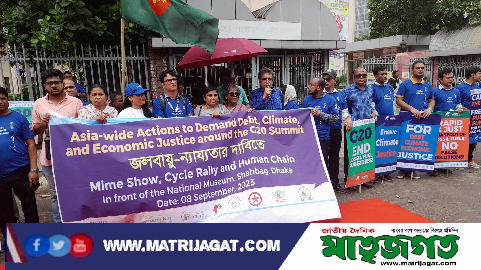 সুরাইয়া আক্তার সেলিনা স্টাফ রিপোর্টারঃ আজ ৮ই সেপ্টেম্বর, শুক্রবার, সকাল ১০ টায় রাজধানীর শাহবাগে জাতীয় জাদুঘর এর সামনে মানববন্ধন, সাইকেল র্যালি ও বিষয়ভিত্তিক মূকাভিনয় প্রদর্শিত হয়েছে। জি-২০ সম্মেলনকে সামনে রেখে ওয়াটারকিপার্স বাংলাদেশ, ইকুইটি বিডি, ইয়ুথ নেট ফর ক্লাইমেট জাস্টিস, সেন্টার ফর পার্টিসিপেটরি রিসার্স এন্ড ডেভেলপমেন্ট, ব্রতী, গ্লোবাল ল’থিংকার্স সোসাইটি, বাংলাদেশ কৃষক ফেডারেশন, সুন্দরবন ও উপকূল সুরক্ষা আন্দোলন, বাংলাদেশ সাইকেল লেন বস্তবায়ন পরিষদ যৌথভাবে এই কর্মসূচীর আয়োজন করে।