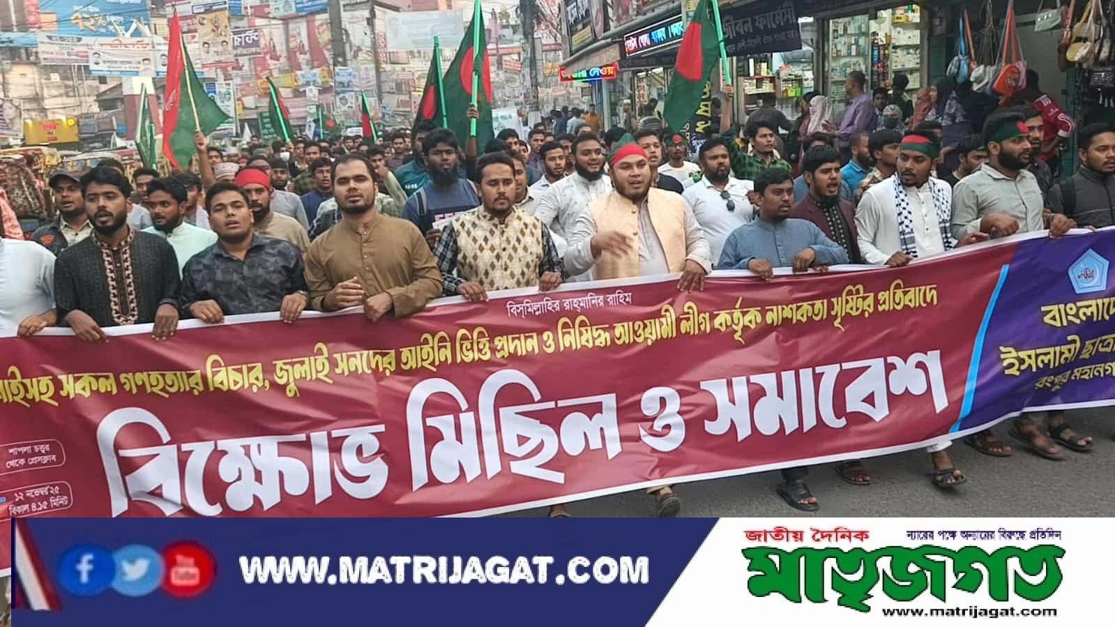 জুলাইসহ সকল গণহত্যার বিচার, জুলাই সনদের আইনি ভিত্তি প্রদান এবং নিষিদ্ধ ঘোষিত আওয়ামী লীগের নাশকতামূলক কর্মকাণ্ডের প্রতিবাদে বিক্ষোভ মিছিল ও সমাবেশ করেছে বাংলাদেশ ইসলামী ছাত্রশিবির রংপুর মহানগর শাখা।