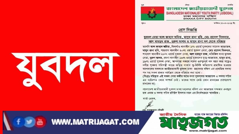 রবিবার রাতে ওই বিবৃতিতে বলা হয়, বহিষ্কৃত ৬ যুবদল নেতা হলেন ঢাকা মহানগর দক্ষিণের আওয়াতাধীন খিলগাঁও থানা ১ নম্বর ওয়ার্ড যুবদলের সাবেক আহবায়ক আল ফাহাদ অমিত, শাহবাগ থানা ২০ নম্বর ওয়ার্ড যুবদল নেতা মাসুদ রানা ছবি, মতিঝিল থানা যুবদল নেতা আল মাহমুদ রাজ, রমনা থানাধীন ১৯ নম্বর ওয়ার্ড যুবদলের যুগ্ম-আহ্বায়ক নুরুল আলম, ১৯ নম্বরওয়ার্ড যুবদল নেতা মাসুদ রানা, এরা গুরুত্বপূর্ণ পদ বহন করা সত্ত্বেও দলীয় শৃঙ্খলা পরিপন্থী কাজে জড়িত থাকার সু-নির্দিষ্ট অভিযোগ প্রমাণিত হওয়ায় আপনাদের সকলকে জাতীয়তাবাদী যুবদল ঢাকা মহানগর দক্ষিণ এর প্রাথমিক সদস্য পদ সহ সকল প্রকার কার্যক্রম থেকে বহিষ্কার করা হয়েছে।