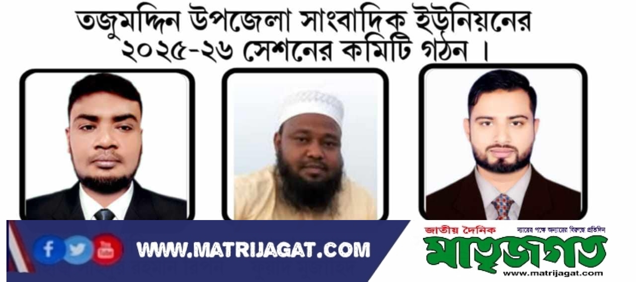 তজুমদ্দিন উপজেলা সাংবাদিক ইউনিয়নের কমিটি গঠন। মোঃ জিহাদ তজুমদ্দিন উপজেলা প্রতিনিধি। ভোলা জেলার তজুমদ্দিন উপজেলা কর্মরত প্রিন্ট ও ইলেকট্রনিক মিডিয়ার সংবাদকর্মীদের নিয়ে ২০২৫-২৬ সেশনের কমিটি গঠন করা হয়েছে ‘তজুমদ্দিন উপজেলা সাংবাদিক ইউনিয়ন’। নতুন এ কমিটির সভাপতি পদে দায়িত্ব পেয়েছেন দৈনিক জাতীয় (দ্যা ইনভেস্ট) পত্রিকার তজুমদ্দিন উপজেলা প্রতিনিধি আলহাজ্ব সাইদুর রহমান রিপন এবং সাধারণ সম্পাদক (দৈনিক দক্ষিনাঞ্চল) পত্রিকার স্টাফ রিপোর্টার ফুয়াদ মুজাহিদ। সাংগঠনিক সম্পাদক হয়েছেন (দৈনিক সত্য সংবাদ) পত্রিকার তজুমদ্দিন উপজেলা প্রতিনিধি ইলিয়াস রনি। মোট ২৩ সদস্য বিশিষ্ট কমিটির অন্যান্য সদস্যরা হলেন- (সহ-সভাপতি) দৈনিক আজকাল পত্রিকার তজুমদ্দিন উপজেলা প্রতিনিধি এম এ হান্নান , (সহ-সভাপতি) বাংলাদেশ বানী পত্রিকার তজুমদ্দিন উপজেলা প্রতিনিধি মনিরুল ইসলাম,(সহ সভাপতি ) দৈনিক দক্ষিনাঞ্চল পত্রিকা স্টাফ রিপোর্টার আমিনুল আহাদ তৌহিদ, (যুগ্ম সাধারণ সম্পাদক) দেশ চ্যানেল ও দৈনিক বাংলার প্রতিচ্ছবি তজুমদ্দিন উপজেলা প্রতিনিধি সুলাইমান পোদ্দার, (যুগ্ম সম্পাদক)দৈনিক সংগ্রাম পত্রিকার তজুমদ্দিন উপজেলা প্রতিনিধি লোকমান হোসেন, (যুগ্ম সম্পাদক) দৈনিক আজকের বরিশাল তজুমদ্দিন উপজেলা প্রতিনিধি নুরে আলম, (সহ সাংগঠনি) দৈনিক কলমের কন্ঠ তজুমদ্দিন উপজেলা প্রতিনিধি নাঈম, (সহ সাংগঠনিক) দৈনিক বরিশালের ক্রাইম তজুমদ্দিন উপজেলা প্রতিনিধি মজিরুদ্দিন রায়হান, (কোষাধ্যক্ষ) বিডি নিউজ ৯৯৯ ভোলা জেলা প্রতিনিধি, ফরহাদ হোসেন ( দপ্তর সম্পাদক) দৈনিক ভোরের অঙ্গিকার পত্রিকার তজুমদ্দিন উপজেলা প্রতিনিধি মমিনুল ইসলাম, (ক্রিয়া সম্পাদক)দৈনিক দেশ বুলেটিন তজুমদ্দিন উপজেলা বিশেষ প্রতিনিধি রাকিবুল ইসলাম, (প্রচার সম্পাদক) দৈনিক ভোলার কাগজ তজুমদ্দিন উপজেলা প্রতিনিধি হাসনাইন, (নির্বাহী সদস্য) দেশ দেশান্তর তজুমদ্দিন প্রতিনিধি মনির খান,(নির্বাহী সদস্য) বাংলাদেশ সংবাদ তজুমদ্দিন উপজেলা প্রতিনিধি মেহেদী হাসান, (সদস্য) ভোরের বাংলা প্রতিদিন নিশাত খান মিরাজ, (সদস্য) দৈনিক দিনের আলো প্রতিদিন নুরনবী রাসেল, (সদস্য) রংধনু নিউজ তজুমদ্দিন উপজেলা প্রতিনিধি জিহাদ, (সদস্য) প্রথম বাংলা প্রতিদিন মমিন উদ্দিন, (সদস্য) জাতীয় দৈনিক মাতৃজগত প্রতিকার প্রতিনিধি জিহাদ , (সদস্য)দৈনিক ভোলার বানী তজুমদ্দিন উপজেলা প্রতিনিধি জুবায়ের হোসেন। সংগঠনটি ৩ রা জানুয়ারি শুক্রবার নতুন কমিটির সদস্যদের তালিকা সামাজিক যোগাযোগমাধ্যমে প্রকাশ করেন। নবগঠিত কমিটির সভাপতি সাইদুর রহমান রিপন বলেন, তজুমদ্দিন উপজেলা কর্মরত বিভিন্ন প্রিন্ট ও ইলেকট্রনিক মিডিয়ার সংবাদকর্মীদের নিয়ে ‘তজুমদ্দিন উপজেলা সাংবাদিক ইউনিয়ন’ গঠন করা হয়েছে। 