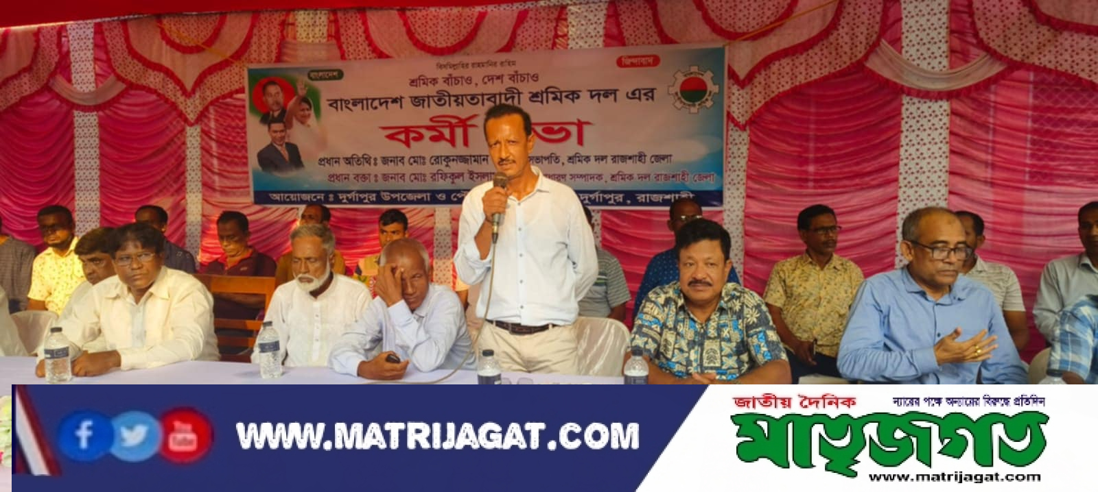 সভায় দুর্গাপুর উপজেলার শ্রমিকদলের সাবেক আহ্বায়ক আলাউদ্দিনের সভাপতিত্বে প্রধান অতিথি হিসেবে উপস্থিত ছিলেন, রাজশাহী জেলা জাতীয়তাবাদী শ্রমিকদলের সভাপতি রোকনুজ্জামান আলম। সভায় প্রধান বক্তা ছিলেন জেলা শ্রমিকদলের সাধারন সম্পাদক রফিকুল ইসলাম তোতা।