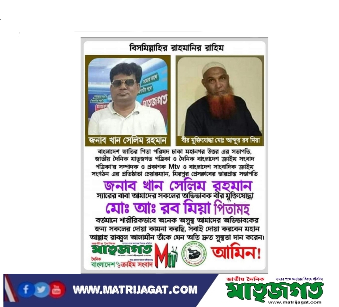 বাংলাদেশ জাতির পিতা পরিষদ ঢাকা মহানগর উত্তর এর সভাপতি, জাতীয় দৈনিক মাতৃজগত পত্রিকা ও দৈনিক বাংলাদেশ ক্রাইম সংবাদ পত্রিকা'র সম্পাদক ও প্রকাশক, মাতৃজগত টিভি  (Mtv) ও বাংলাদেশ সাংবাদিক ক্রাইম সংগঠন এর প্রতিষ্ঠাতা চেয়ারম্যান, মিরপুর প্রেসক্লাবের ভারপ্রাপ্ত সভাপতি #জনাব_খান_সেলিম_রহমান স্যারের বাবা আমাদের সকলের অভিভাবক বীর মুক্তিযোদ্ধা #মোঃ_আঃ_রব_মিয়া বর্তমানে শারীরিকভাবে অনেক অসুস্থ, আমাদের অভিভাবকের জন্য সকলের দোয়া কামনা করছি।