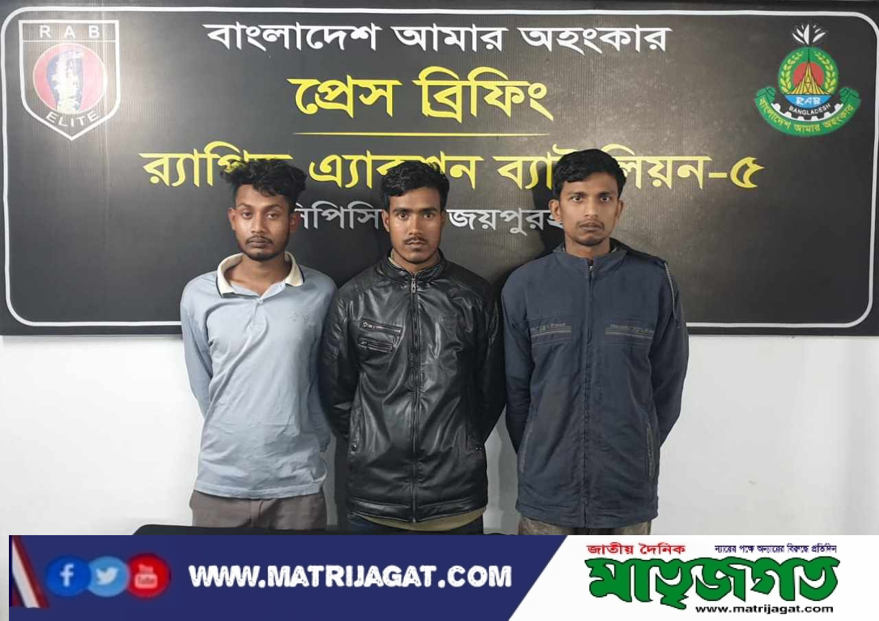 আটকরা হলো- ধামইরহাট উপজেলার মুকুন্দপুর গ্রামের নৃপেন্দ্র নাথ সরকারের ছেলে নিত্য সরকার (২৪) এবং জয়পুরহাট জেলার সদর উপজেলার বিল্লা গ্রামের আজিজুল ইসলামের ছেলে শহিদ হোসেন (২২) ও দোগাছী গ্রামের আবু হানিফের ছেলে সিফাত হোসেন (১৮)।