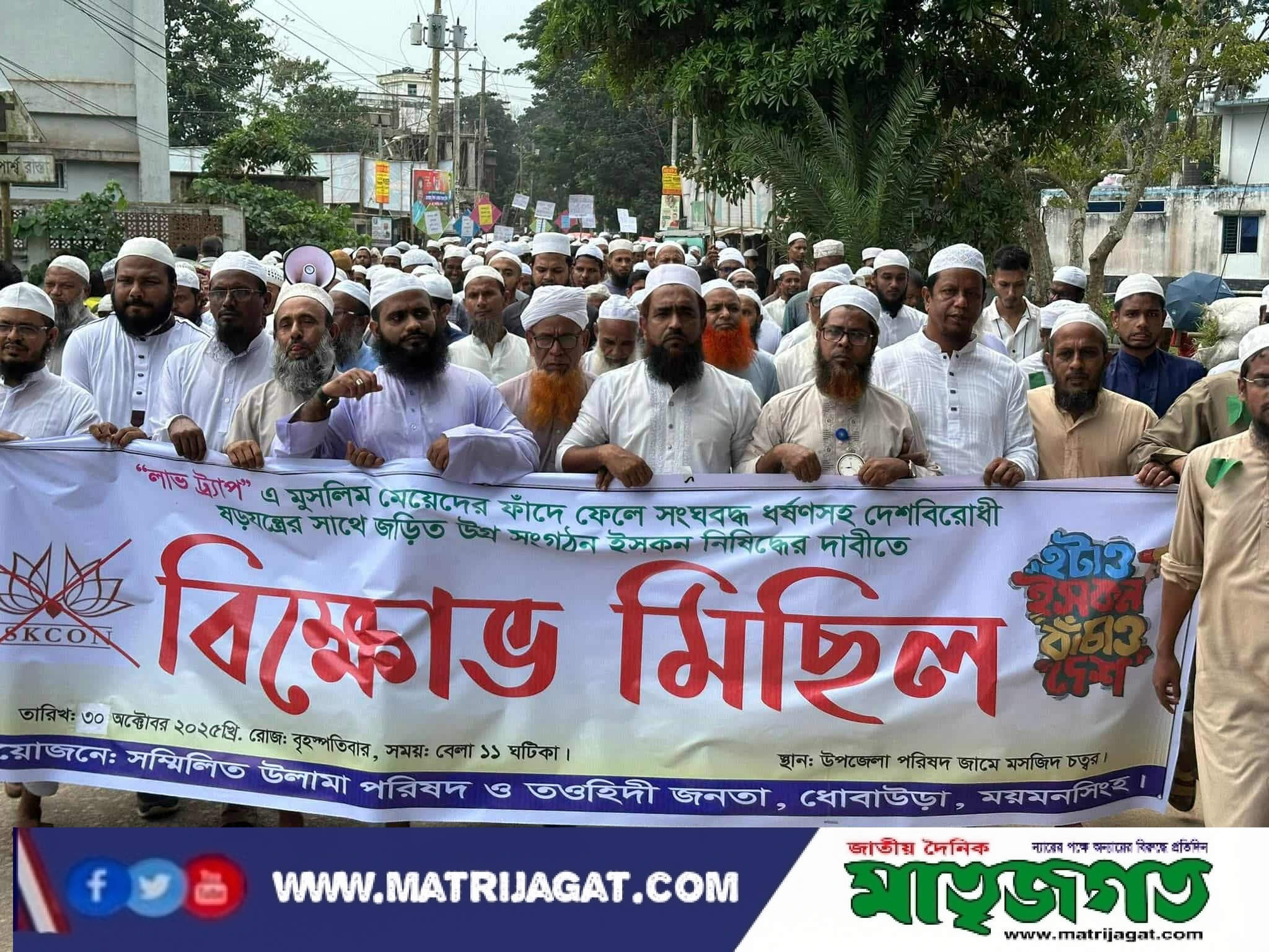 ময়মনসিংহের ধোবাউড়ায় ইসকন নিষিদ্ধের দাবিতে বিক্ষোভ মিছিল অনুষ্ঠিত হয়েছে।আজ বৃহস্পতিবার সকালে উপজেলা সম্মিলিত ওলামা পরিষদ ও তওহিদী জনতার ব্যানারে এই বিক্ষোভ মিছিল অনুষ্ঠিত হয়।