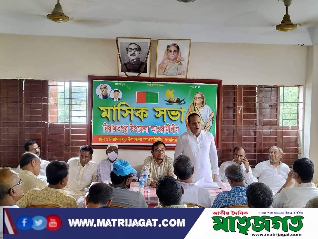 নওগাঁর নিয়ামতপুরে উপজেলা আওয়ামী লীগের মাসিক সভা অনুষ্ঠিত হয়েছে। বুধবার সকালে ১০ঘটিকায় উপজেলা আওয়ামী লীগ কার্যালয়ে এ সভা অনুষ্ঠিত হয়। উপজেলা আওয়ামী লীগের সাধারণ সম্পাদক জাহিদ হাসান বিপ্লবের সঞ্চালনায় সভাপতিত্ব করেন উপজেলা আওয়ামী লীগের সহ-সভাপতি ইশ্বর চন্দ্র বর্মন। এ সময় আরও উপস্থিত ছিলেন উপজেলা আওয়ামী লীগের সহ-সভাপতি ও উপজেলা পরিষদ চেয়ারম্যান ফরিদ আহম্মেদ, সরকার কামাল উদ্দিন, যুগ্ম সম্পাদক মনোরঞ্জন মজুমদার ,দপ্তর সম্পাদক ইসমাইল হোসেন ,সহ উপজেলা ও ইউনিয়ন আওয়ামী লীগের নেতৃবৃন্দ।