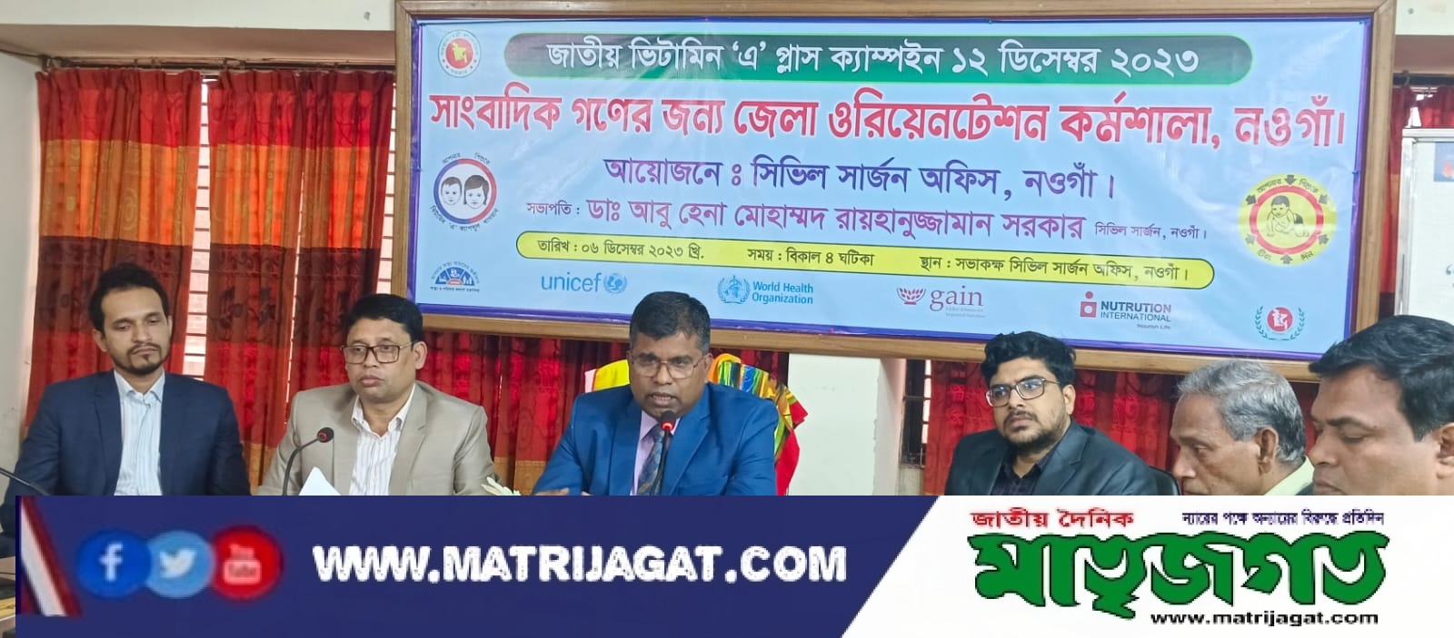 নওগাঁয় জাতীয় ভিটামিন 'এ' প্লাস ক্যাম্পেইন উপলক্ষে গণমাধ্যম কর্মীদের সাথে মতবিনিময় সভা অনুষ্ঠিত হয়েছে। আজ বুধবার বিকেল ৪টায় নওগাঁ সিভিল সার্জন কার্যালয়ের সভাকক্ষে সভাপতিত্ব করেন- জেলা সিভিল সার্জন ডা: আবু হেনা মোহাম্মদ রায়হানুজ্জামান সরকার সিভিল সার্জন বলেন- আগামী ১২ ডিসেম্বর জেলার ১১টি উপজেলা ও ৩টি পৌরসভায় ২ হাজার ৪৫০ টি টিকা কেন্দ্রে ৪ হাজার ৯২০ জন স্বেচ্ছাসেবীর মাধ্যমে মোট ৩ লাখ ৪৬ হাজার ৮৩৩ জন শিশুকে ভিটামিন এ ক্যাপসুল খাওয়ানো হবে।