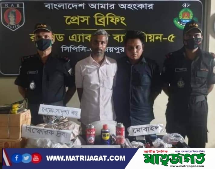 নওগাঁয় র্যাবের অভিযানে বিপুল পরিমান বিস্ফোরক দ্রব্য উদ্ধার সহ দু'জন আটক। সত্যতা নিশ্চিত করে র্যাব-৫, সিপিসি-৩, জয়পুরহাট কাম্প থেকে জানানো হয়, র্যাব-৫, রাজশাহী এবং র্যাব সিপিসি-৩, জয়পুরহাট ক্যাম্পের একটি চৌকস অপারেশনাল দল র্যাব-৫, রাজশাহীর ব্যাটালিয়ন অধিনায়ক লেঃ কর্ণেল রিয়াজ শাহ্রিয়ার, পিএসসি, জি, আর্টিলারি, মেজর সাকিব এবং কোম্পানী অধিনাকয় সহকারী পুলিশ সুপার মোঃ মাসুদ রানা এর নেতৃত্বে মঙ্গলবার ৫ জুলাই পূর্বরাতে নওগাঁ জেলা সদর থানাধীন পৌরসভার পার নওগাঁ ধোপাপাড়া গ্রামস্থ মোবারক আলী (৫৭), পিতা-মৃত মোশারফ আলী'র ৭ম তলা ভবনে অভিযান পরিচালনা করে বিপুল পরিমান বিস্ফোরক দ্রব্য ১/ লালবর্ণের কেমিক্যালযুক্ত পাউডার যার ওজন ৪ কেজি ২০০গ্রাম, ২/ প্লাষ্টিকের ব্যাগের ভিতর সাদা বর্ণের কেমিক্যালযুক্ত পাউডার যার ওজন ২ কেজি ৫০০গ্রাম, ৩/ পলিথিনের ভিতর ক্রিষ্টাল সাদা বর্ণের পাউডার যার ওজন ২ কেজি ৪০০গ্রাম, ৪/পলিথিনের ভিতর কেমিক্যালযুক্ত মাটি যার ওজন ১ কেজি ৮০০গ্রাম, ৫/ বিউটেন গ্যাসযুক্ত গঙঙঘ কৌটা ২টি, ৬/ দাহ্য পদার্থযুক্ত ডউ-৪০ কৌটা ১ টি, ৭/ লাল স্কসটেপ দ্বারা মোড়ানো বোম সাদৃশ্য বস্তু ১ টি, ৮/ একটি ব্যাটারী যাতে চঅককঙ ৬ঋ২২ ৯ঠ সহ আরো লেখা আছে, ৯/ লাল স্কসটেপ ২ টি, ১০/ স্কসটেপ দ্বারা বাধাঁনো মোবাইল ব্যাটারী ২টি, ১১/রেজিস্টেন্স ৭টি, ১২/ বাটন সুইচ ৮টি, ১৩/ টিউনিং সুইচ ৬টি, ১৪/ ওঈ ১টি যাতে তঐঅঘএ লেখা আছে, ১৫/ ইন্ডিকেটর ল্যাম্প ৮টি+ ইত্যাদি সহ আসামী ১/ মোঃ ওসমান গনি জিসান (৩০), পিতা-মোঃ আব্দুল ওয়াদুদ, সাং-দক্ষিন বাড্ডা, বাসা নং-প-২/২, ওয়ার্ড নং-২১, থানা-বাড্ডা মেট্রো, জেলা-ঢাকা(ডিএমপি উত্তর), এবং আসামী ২/ শংকর অধিকারী মুকেশ (৪০), পিতা-মনোরঞ্জন অধিকারী, সাং-নোয়াপাড়া, থানা-অভয়নগর, জেলা-যশোর। উপরোক্ত দু'জনকে হাতেনাতে গ্রেফতার করা হয়।
