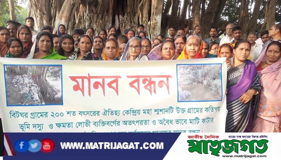 ব্রাহ্মণবাড়িয়া নবীনগর উপজেলার বিটঘর উত্তর পাড়া হিন্দু সম্প্রদায়ের দুই শত বছরের পুরনো শ্মশানের যায়গা দখল ও পুকুর থেকে মাটি কাটার প্রতিবাদে মানববন্ধন করেছে এলাকাবাসী।আজ বৃহস্প্রতিবার বিকালে শ্মশানের সামনে মানববন্ধন টি অনুষ্ঠিত হয়।